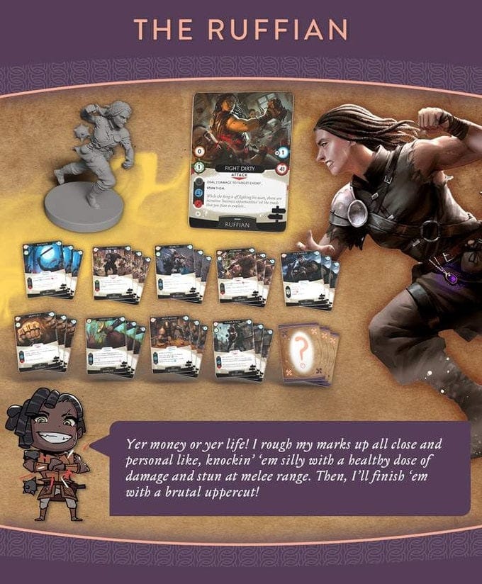 THE RUFFIAN tumbles through life, never staying anywhere too long. In her wake, she leaves behind broken jaws, empty purses, and filled hearses. Instead of working for her coin like an ordinary sap, she'll get hers with a growl, grab, and a club to the gut.