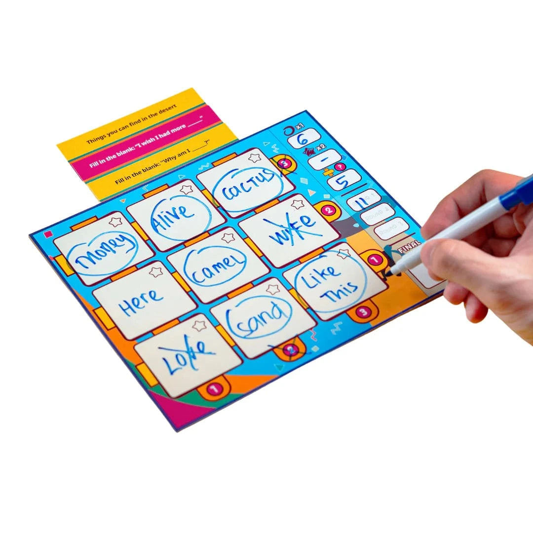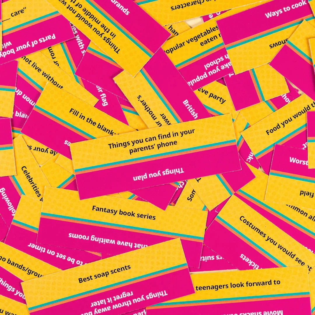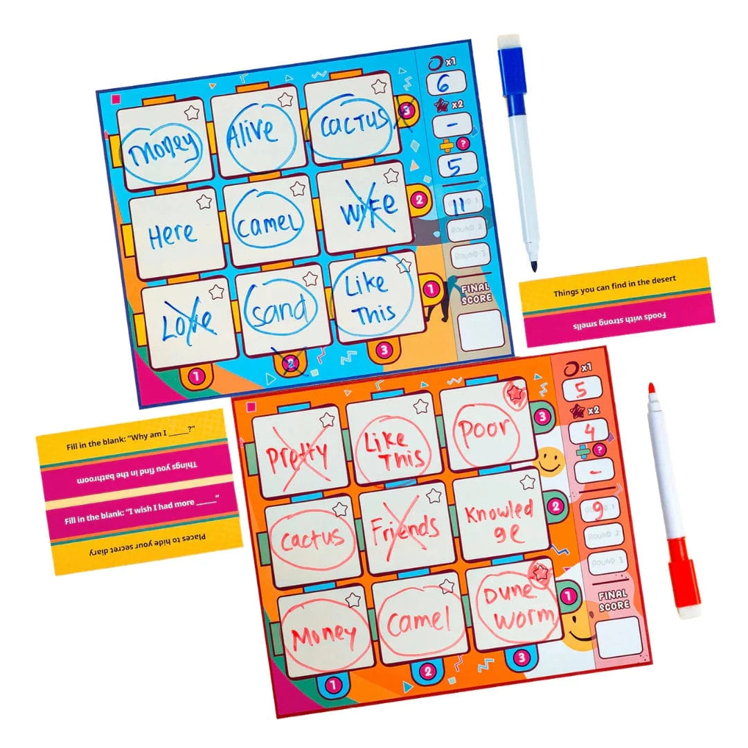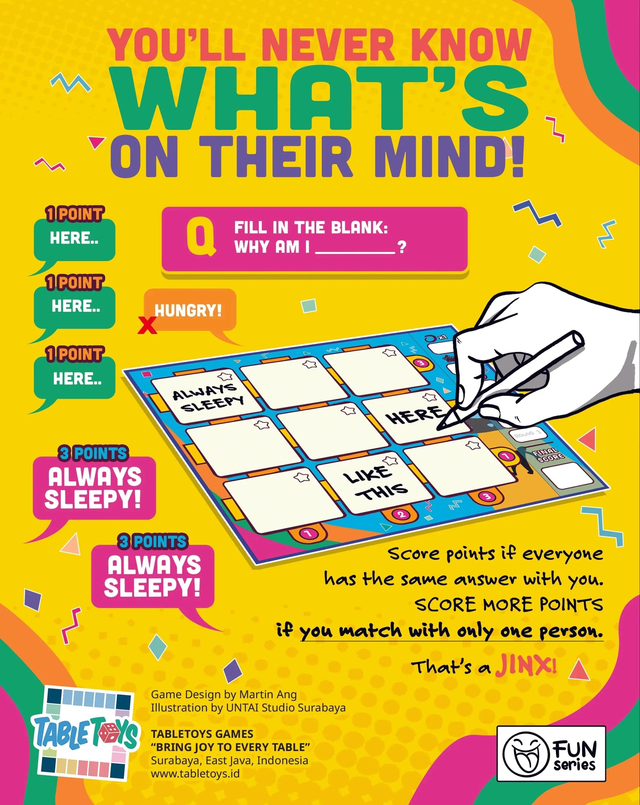 The aim: to score the most points by writing down answers that matches other people in the group. Be careful with your words! If your answer doesn't match anybody in the group, you jinxed it and receive no points. However, if only one other person matches with you, you score more points - it's a JinxO!