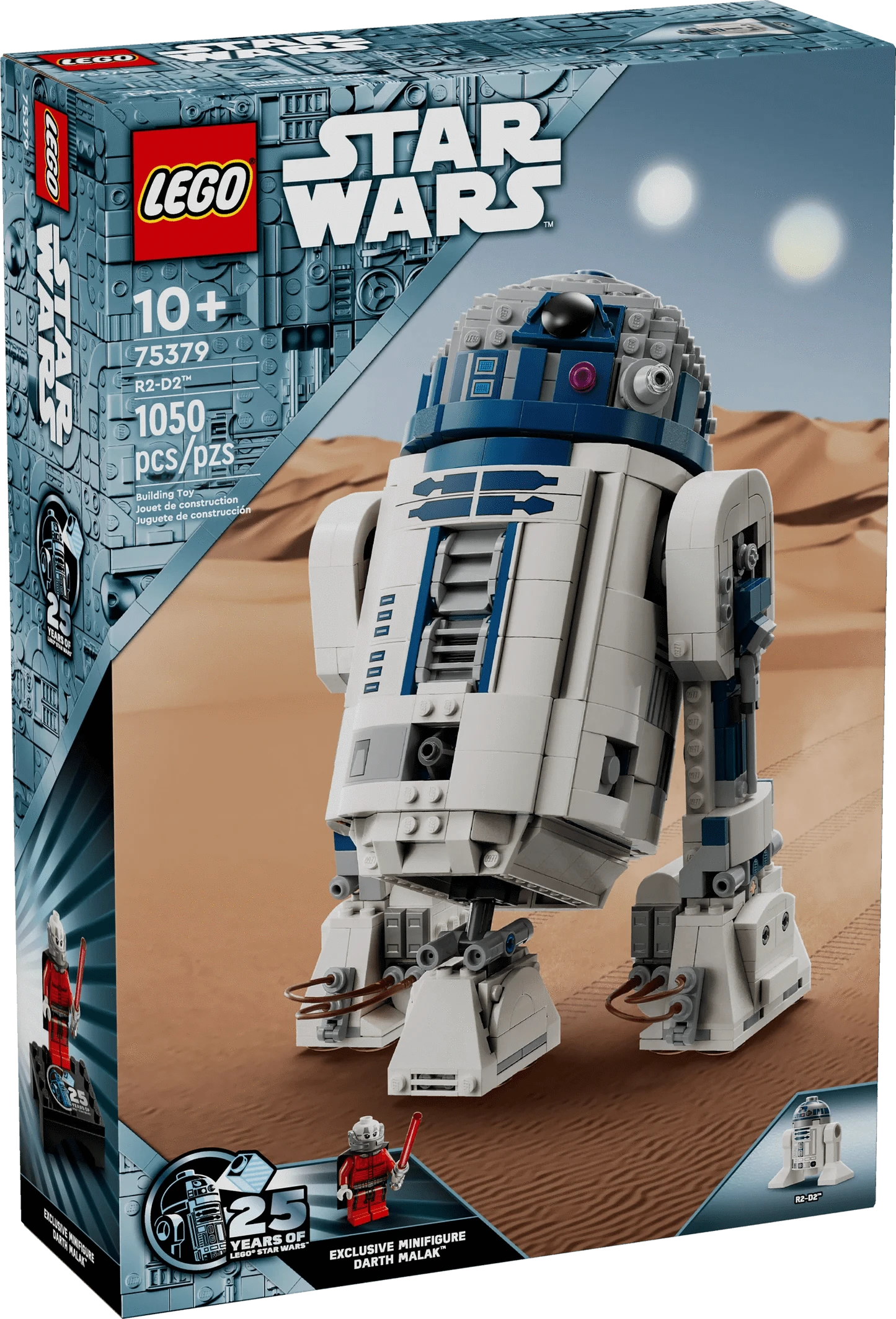 Invite the most beloved droid in the Star Wars™ universe into your home with this playful, buildable model. Rotate R2-D2’s head and attach his third leg when it’s time to move. You can also connect his iconic radar and tools. Showcase your creation with the R2-D2 information plaque, an R2-D2 LEGO® figure and a special LEGO Star Wars 25th anniversary minifigure of Darth Malak with a display stand.