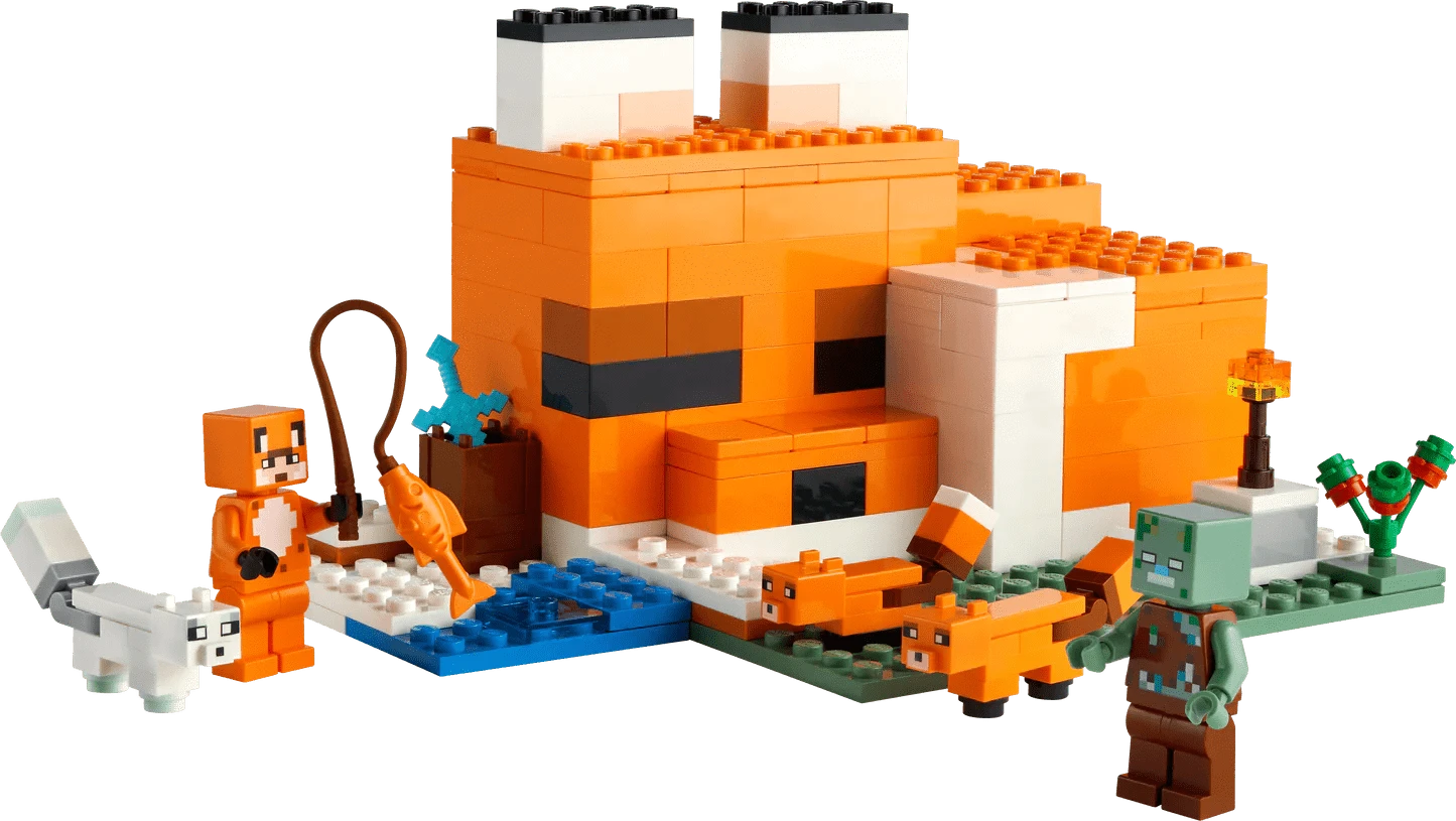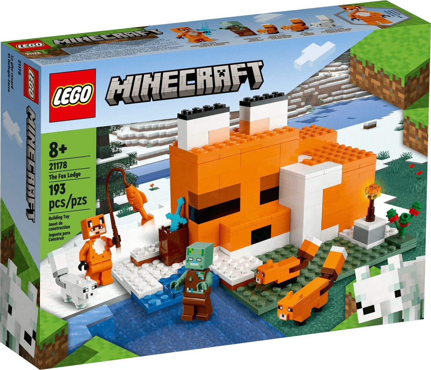 Use your Minecraft® skills to create a giant fox house. The open back and lift-off roof make it easy to arrange the furniture and have lots of fun inside. Outside there’s a baby fox, adult fox and Arctic fox to feed with sweet berries before they curl up to sleep. Finally, it’s time for some fishing. Watch out! A drowned is heading your way! Grab your sword to fend off the zombie.