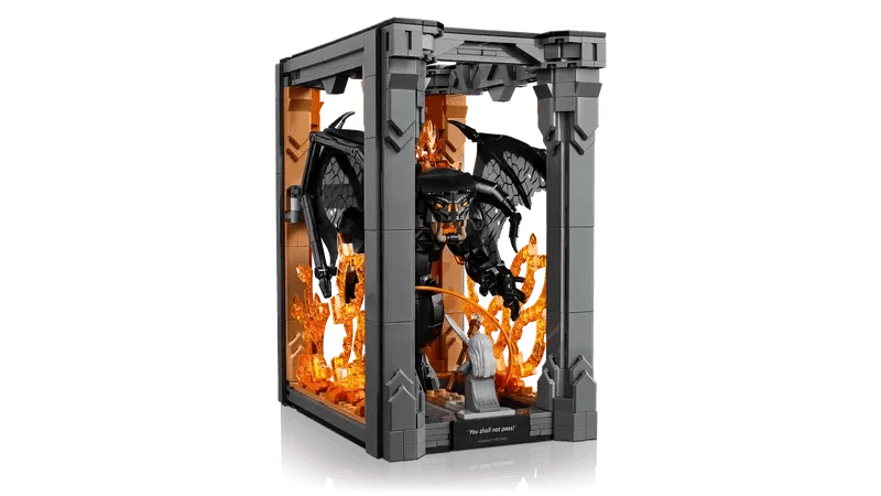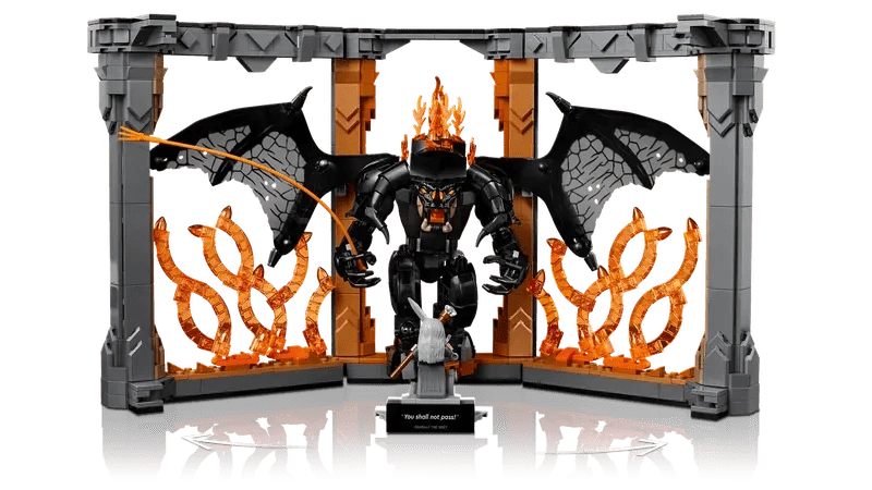 Bearing a plaque with the words ‘You Shall Not Pass’, the model depicts Gandalf the Grey™ in a fearless stance and the Balrog with its mighty wings unfurled against a blazing wall of flames. Both characters are detachable and the Gandalf minifigure has a staff and sword, while the Balrog figure wields a fiery whip and features posable limbs and wings for dynamic display.