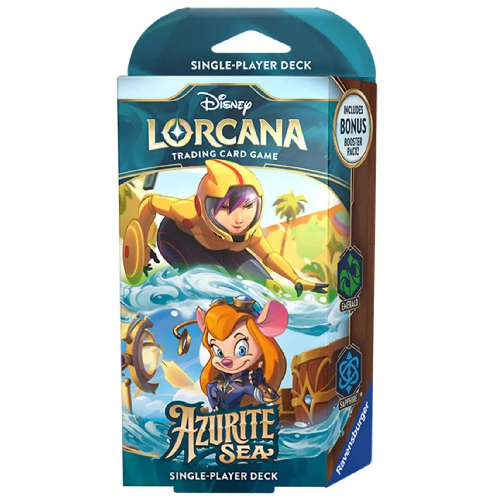 Set your sights on the horizon! Following an ancient map, you'll sail the beautiful yet unpredictable Azurite Sea. Joining you on board, and among this Disney Lorcana set’s 200+ cards, are friends from Big Hero 6 and Chip 'n' Dale: Rescue Rangers! Whether you face kakamora pirates or the whirlpool of a new mystery, your shipmates are ready to head bow-first into adventure. No need to rig the sails or swab the deck . . . jump right into the adventure with these ready-to-play Azurite Sea starter decks. Each contains a prebuilt deck of 60 cards, including two beautiful foil cards. The additional booster pack ensures you have a few extra hands on deck to face any peril.