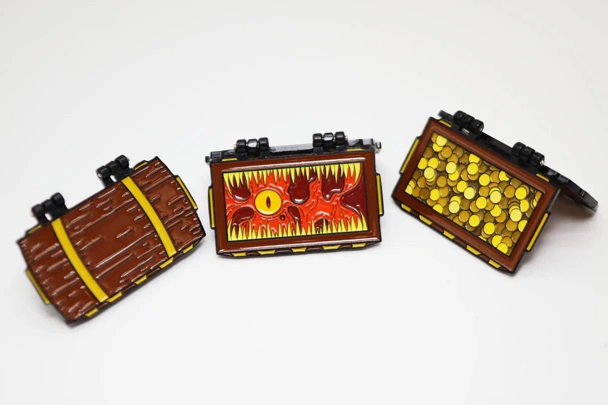 • Pinatures combine an enamel pin and a miniature that's usable in fantasy RPGs! These hinged pins have matching outer designs so you won't know if you are opening a treasure chest or a monster. These models are designed to fit on a standard 1" battle mat.