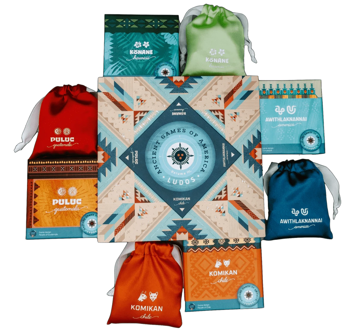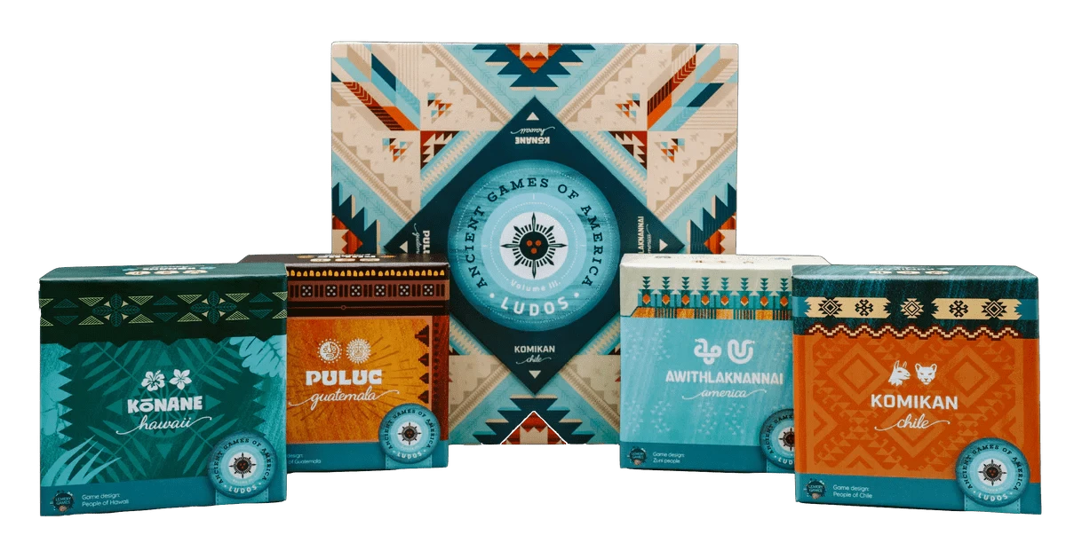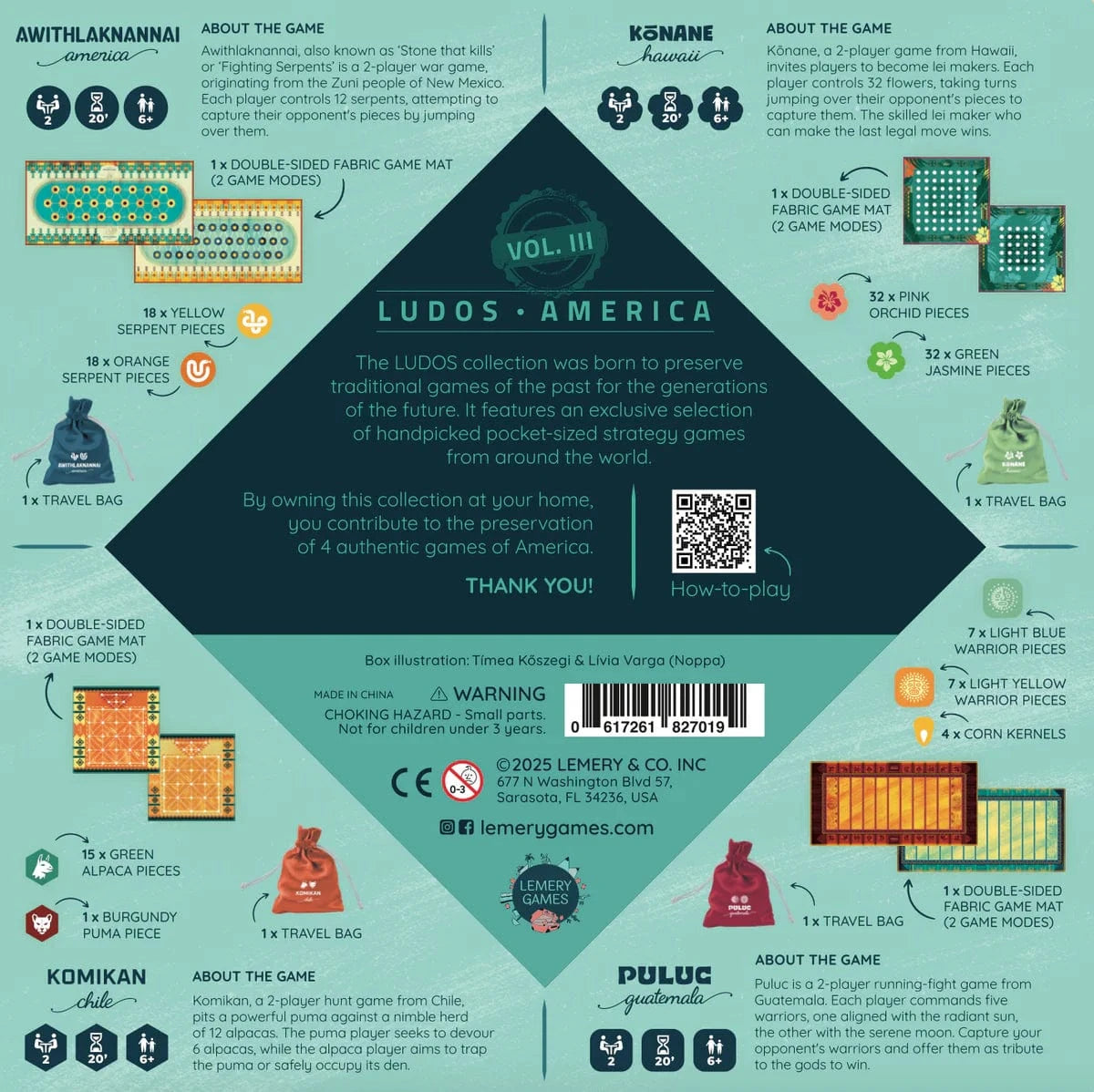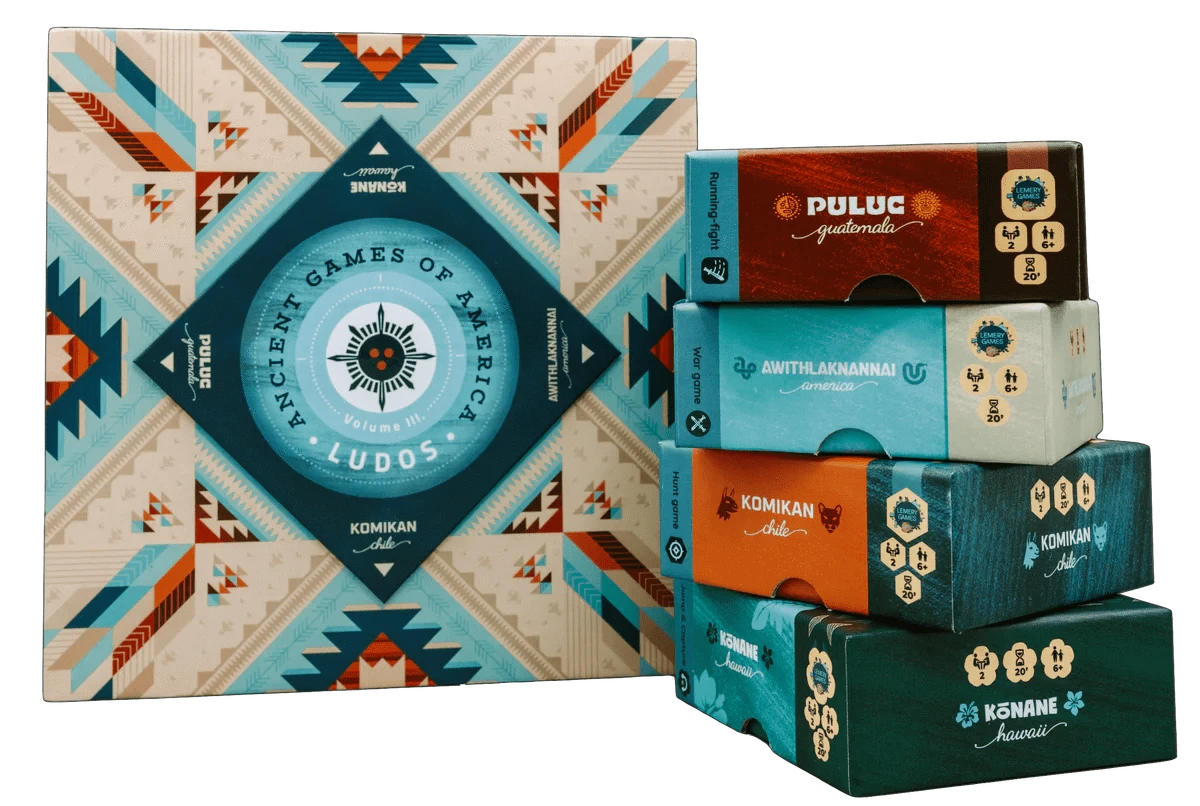 The second volume, LUDOS America features four, 2-player ancient strategy games from Chile (Komikan), Guatemala (Puluc), Hawaii (Kōnane) and the American Southwest (Awithlaknannai).