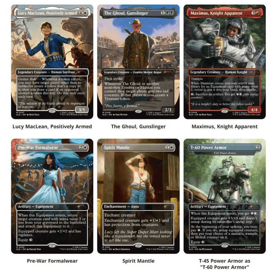 For the first time, the survivors from Prime Video’s Fallout series make their debut with new-to-Magic designs. Lucy MacLean brings her optimism to the battlefield with The Golden Rule, a once-per-turn ability that lets you trade token favors for card draw. The Ghoul feeds on death itself, stacking up Rad counters to mill or wipe out opponents—or, if you’re feeling bold, take that radiation yourself for extra resources. And Maximus, ever the true believer, turns scrap into strength, fueling up on energy as he powers up his own T-60 Power Armor.