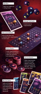 Some parts of each mission are particularly hazardous, awarding players who attempt them with hazard tokens that are worth prestige at the end of the game. However, the player with the most hazard symbols is reprimanded for their chaotic conduct and is awarded no extra end-game prestige.