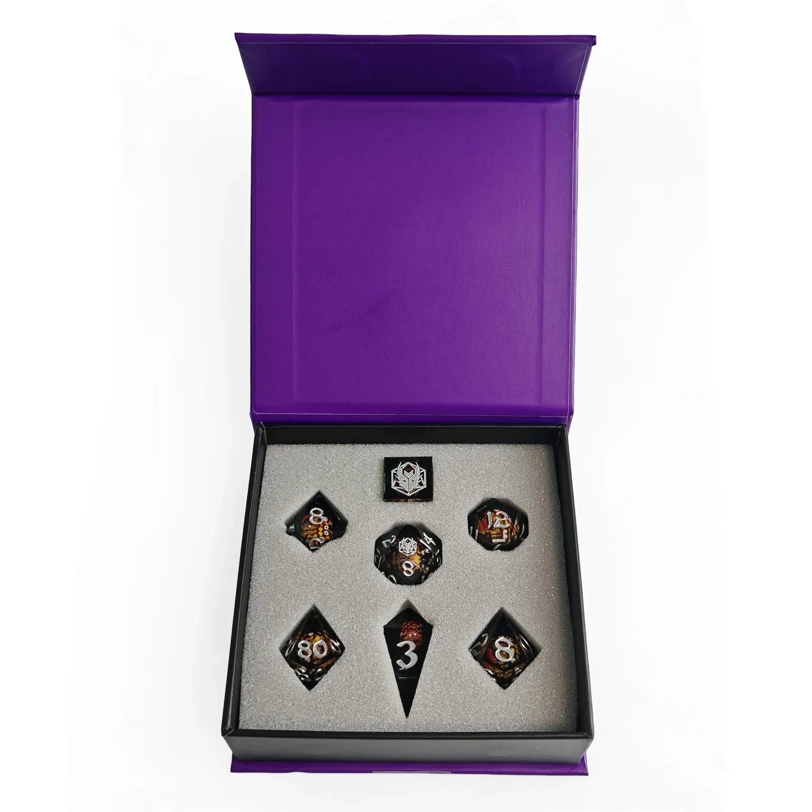 Enclosed within this box is a full set of seven precisely crafted, sharp-edged resin dice, each carefully hand-sanded. A lucky one in four adventurers will receive a set of liquid core sharp-edge resin dice!