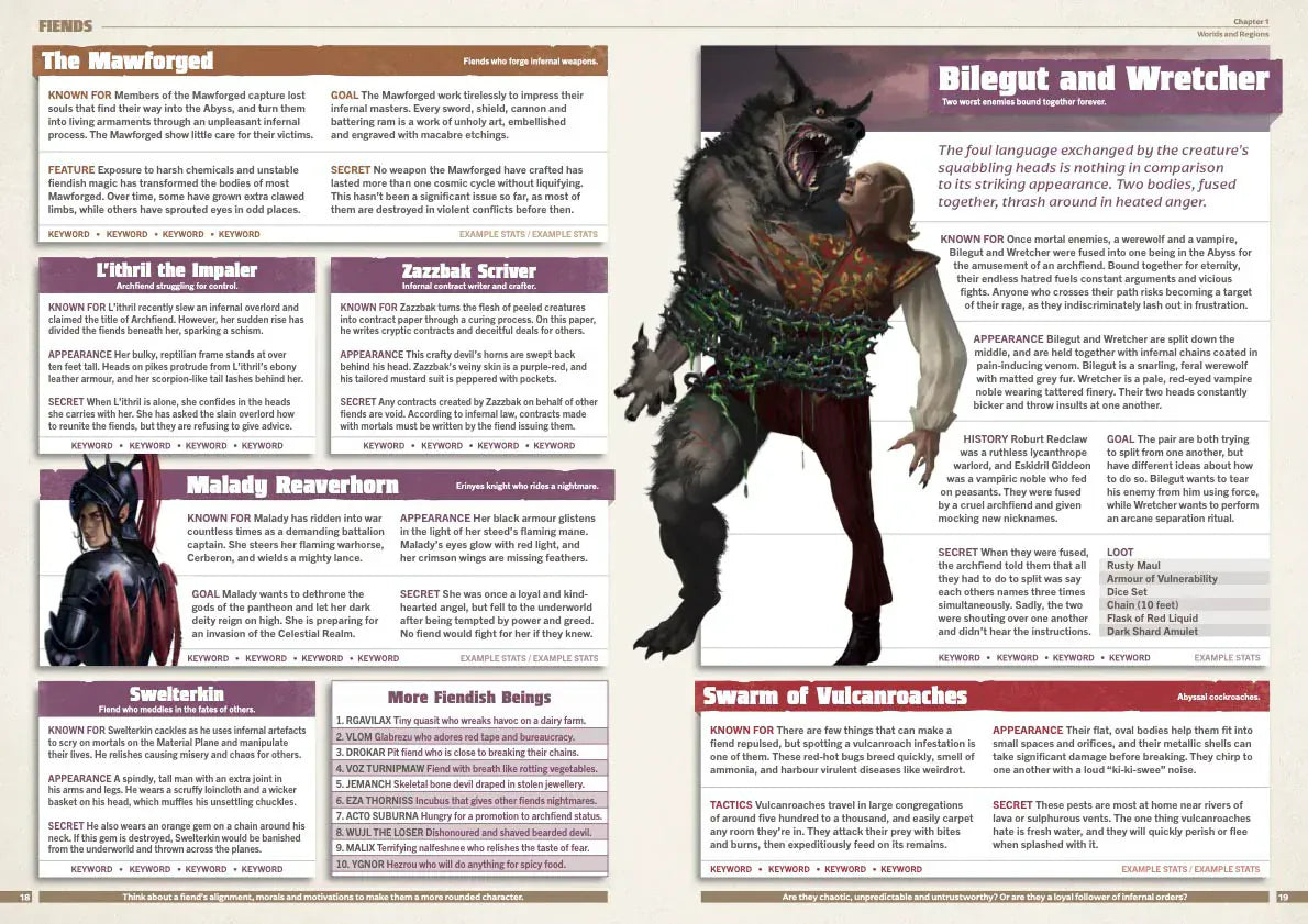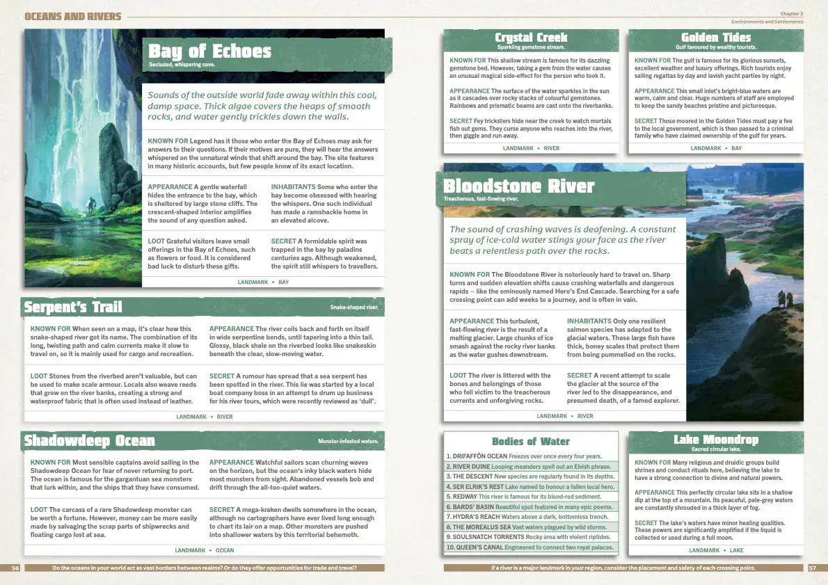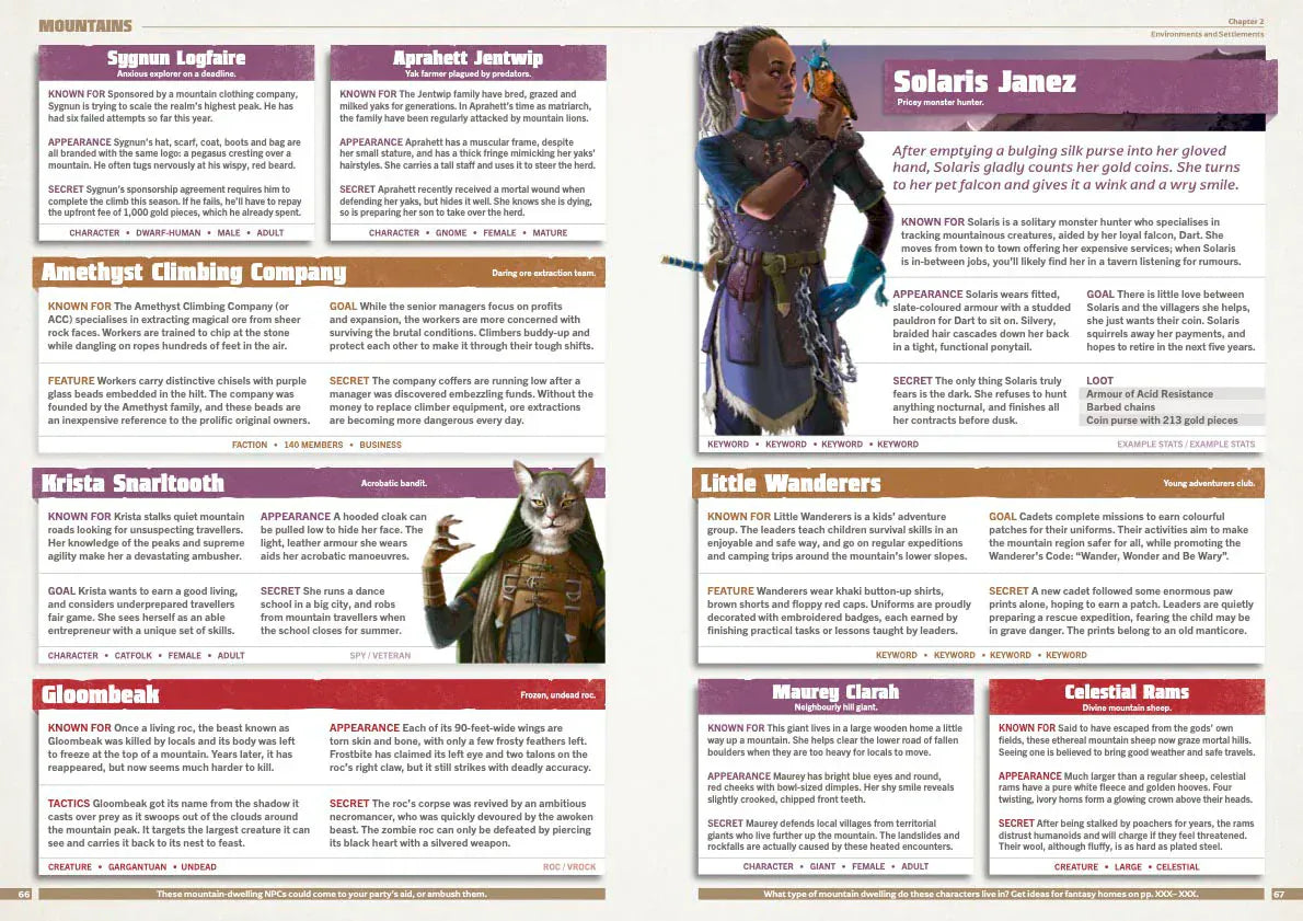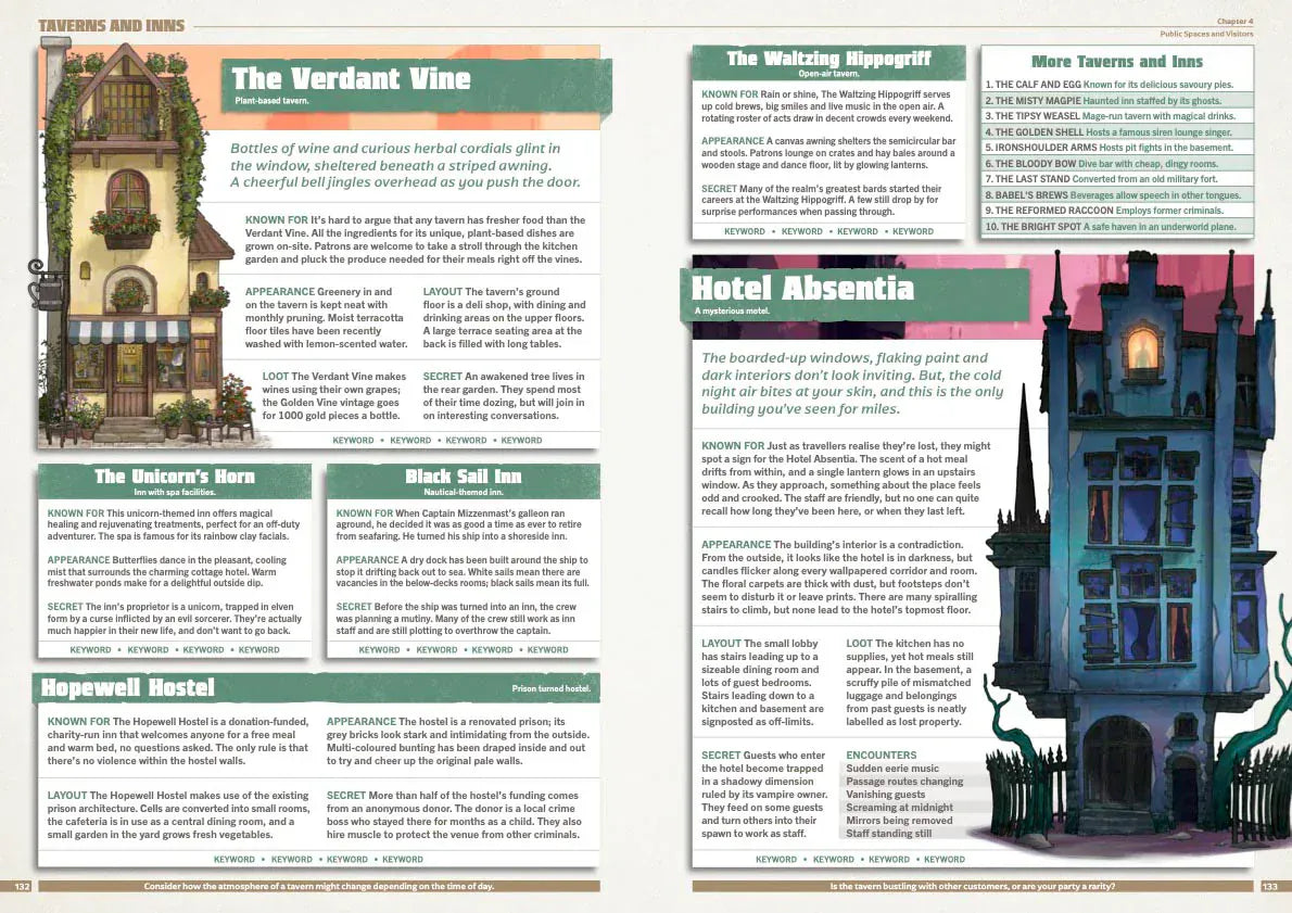 The book is perfect for when your players wander off the beaten track, or when you just want to add something surprising and fresh to your world. Every entry is laid out clearly and colour-coded, so you can easily scan through and find awesome content quickly.