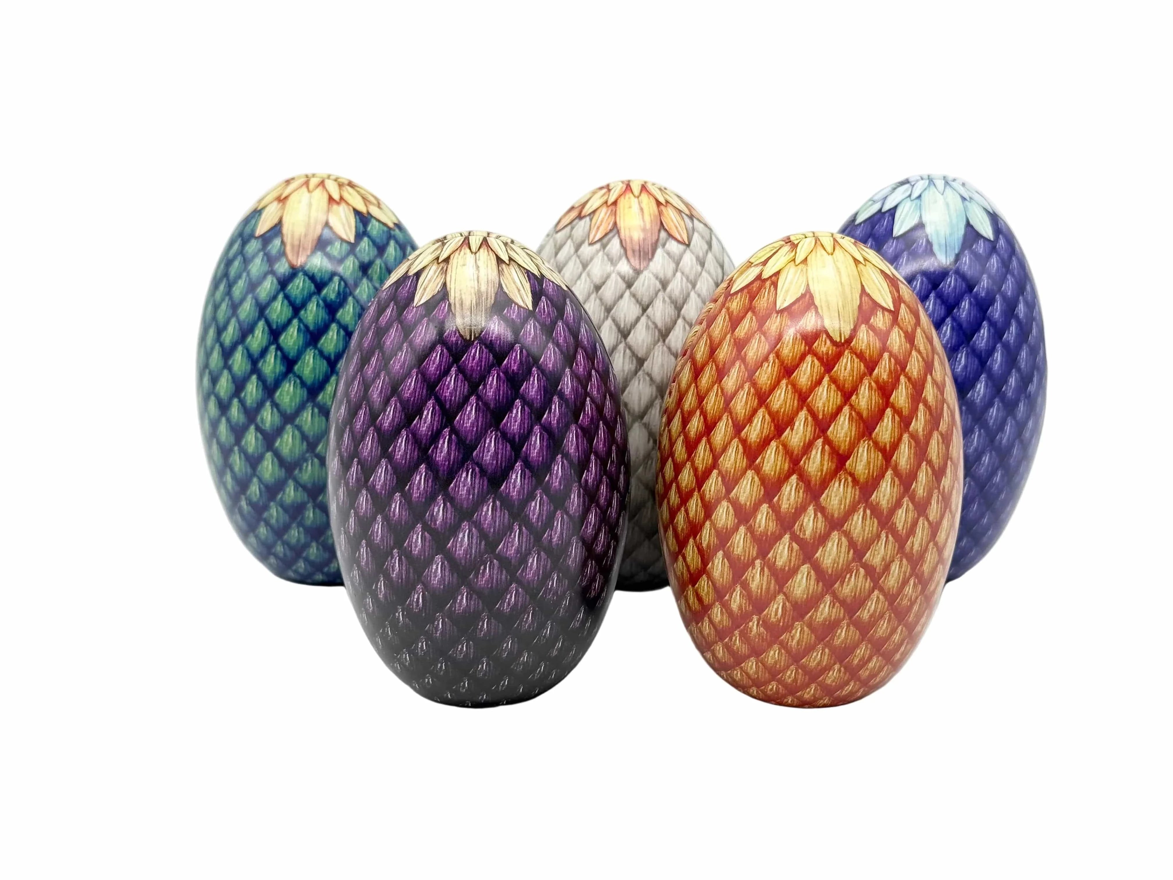 Comes in egg-inspired collector’s tin for secure storage and display.