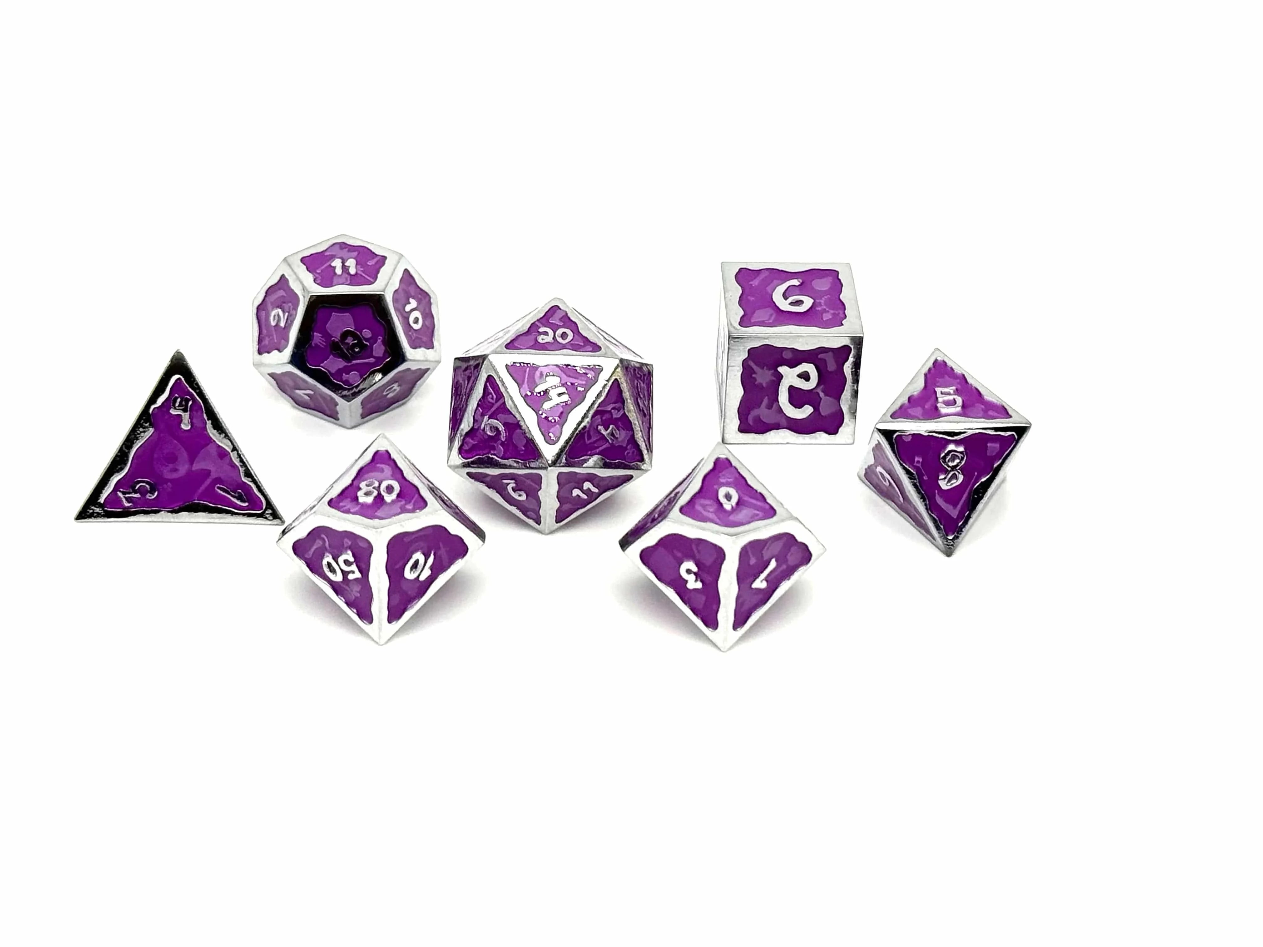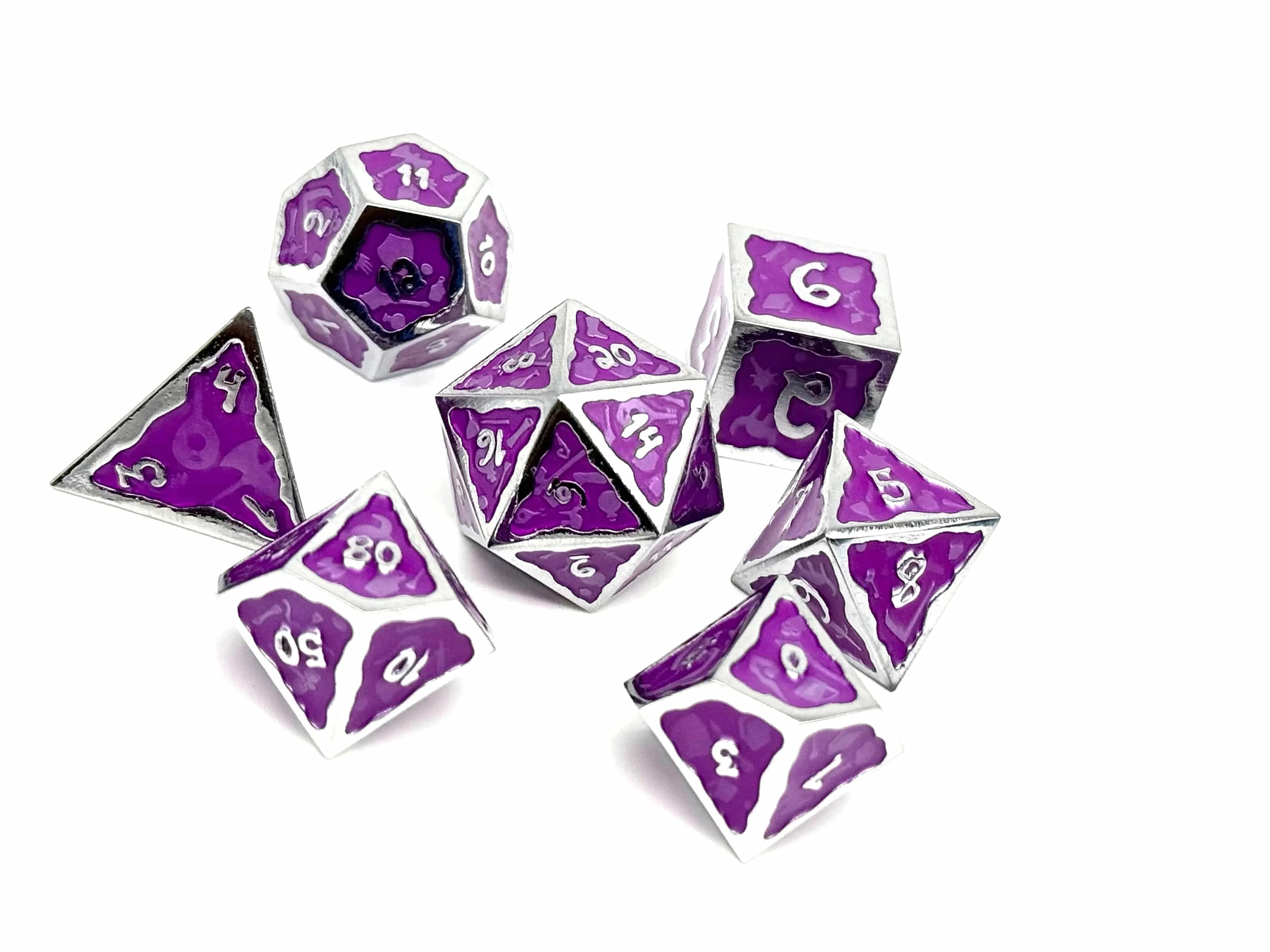 Introducing the Ooze of Doom RPG Set, a mesmerizing addition to your dice collection! Crafted from high-quality zinc alloy, these dice are not only durable but also exude a sense of elegance with their striking purple and silver hues.