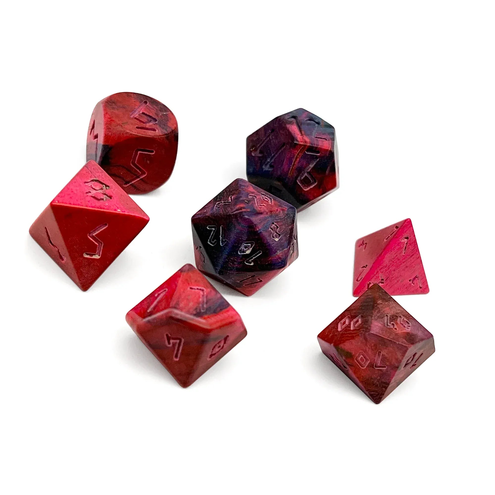 Perfect for both passionate gamers and collectors. The Red Striped Wood dice set features intricately carved numbers directly into the wood, maintaining the natural aesthetic without any additional fill. The striking red stripes and organic grain patterns make each die a unique piece of art, adding a touch of elegance and sophistication to every roll. Enhance your gaming experience with the Red Striped Wood dice set, where nature’s beauty and craftsmanship come together to create a truly exceptional and functional work of art.
