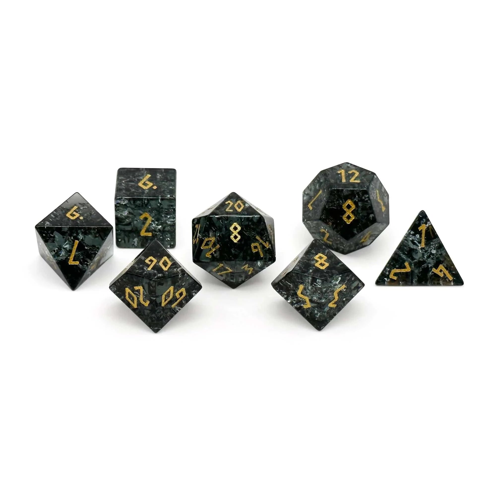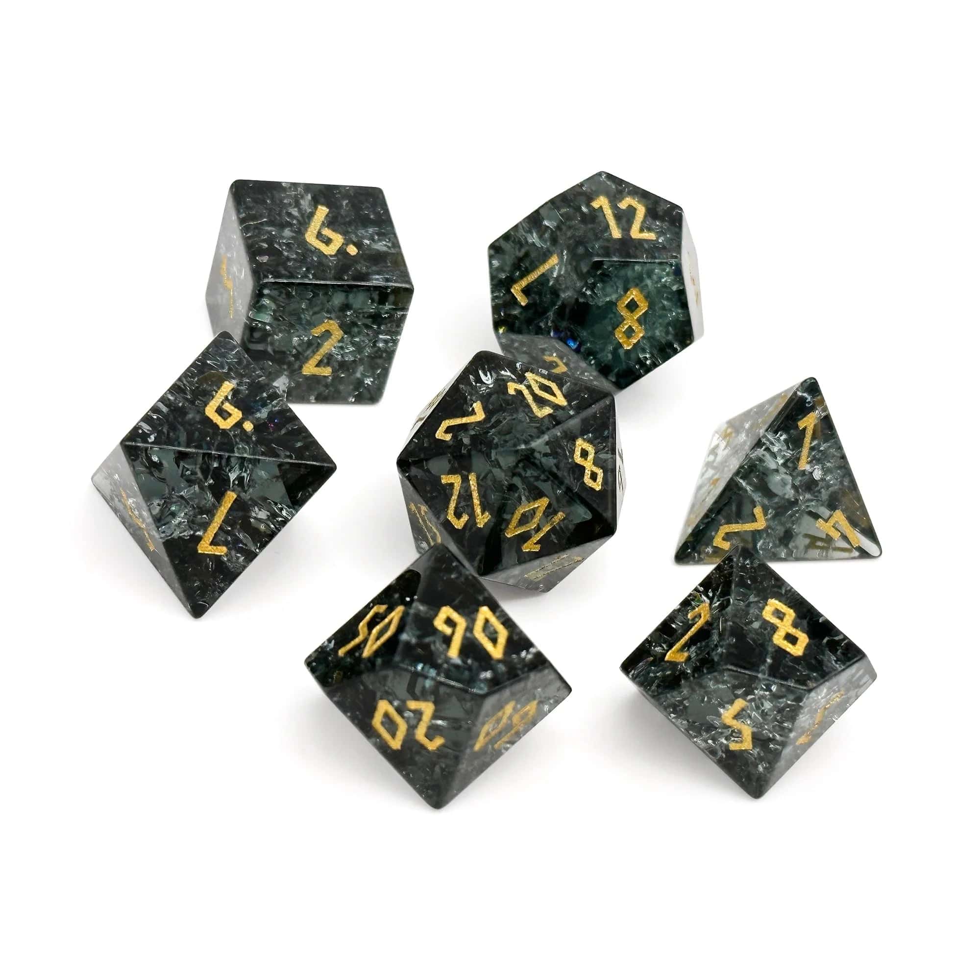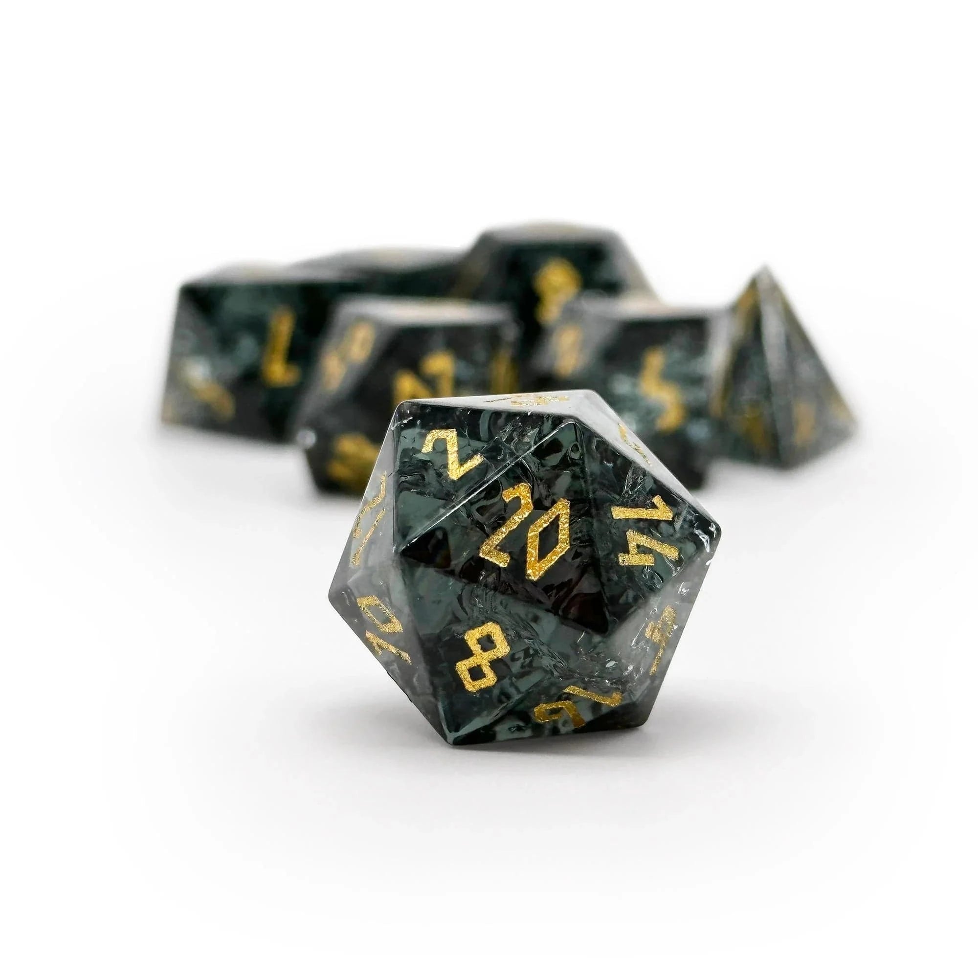 Fortitude of Strength. The dice set is made using zircon glass—a material used for filling up outdoor fireplaces. Known to withstand incredibly high temperatures, Zircon emerald comes with a shattered effect and features stone-like hardness. So it’s safe to say, this dice set will last you for thousands of DnD sessions, if not more. The unique material shimmers under light and instantly mesmerizes everyone at the table, even those who possess impressive sets themselves. Hand-carved in Zircon glass with a luxurious amber hue, this dice set brings you all the luck you need to successfully complete your campaign to get back to safety. Made using a material that can withstand up to 1300° F, this dice set will accompany you to the deepest dungeons and give you the strength to survive anything.