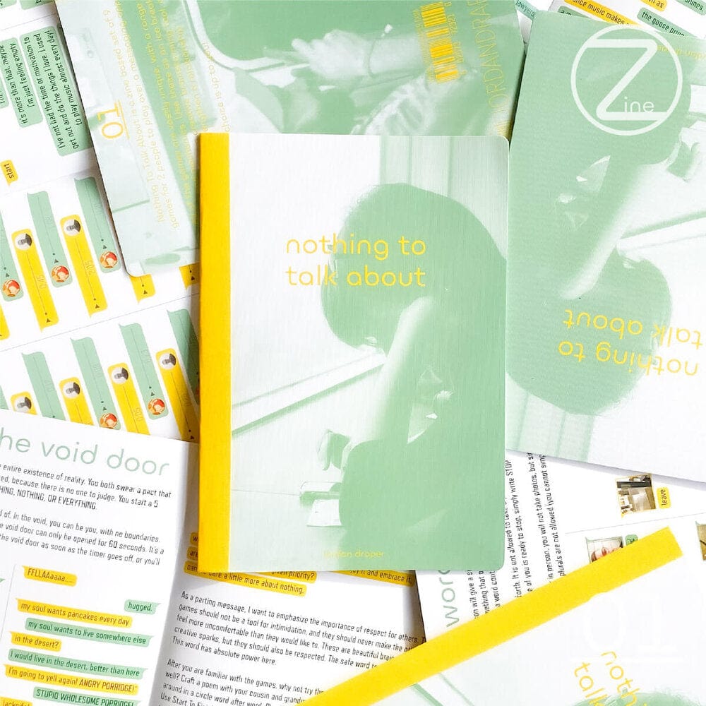 Nothing To Talk About is a zine with 9 games for 2 people to play over any messaging app. All of the games are vastly unique, with a range of styles and mechanics. Use these as an ice breaker, a stress reliever, a creative brainstorming tool, or a way to explore a relationship! Each game encourages play through a ritualized setting. One simply needs to send a photo of a single page of rules to someone on the other end of their phone, and the game begins!