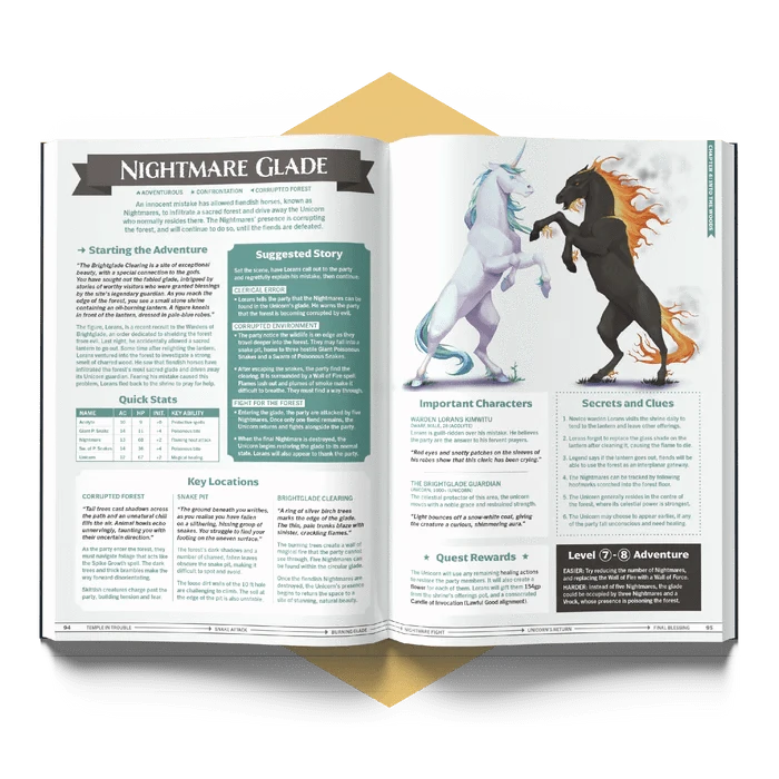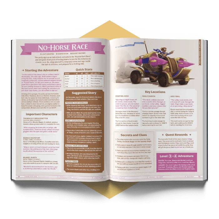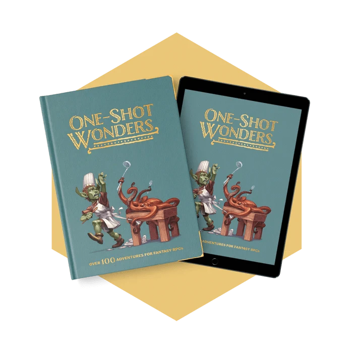 Each DnD adventure in One-Shot Wonders takes around 3 hours to play and, because they're on two pages or less, you can read everything in minutes. The layouts are clean, the plot twists are fresh, and you're covered from levels 1 to 20. You'll spend less time reading and more time rolling.