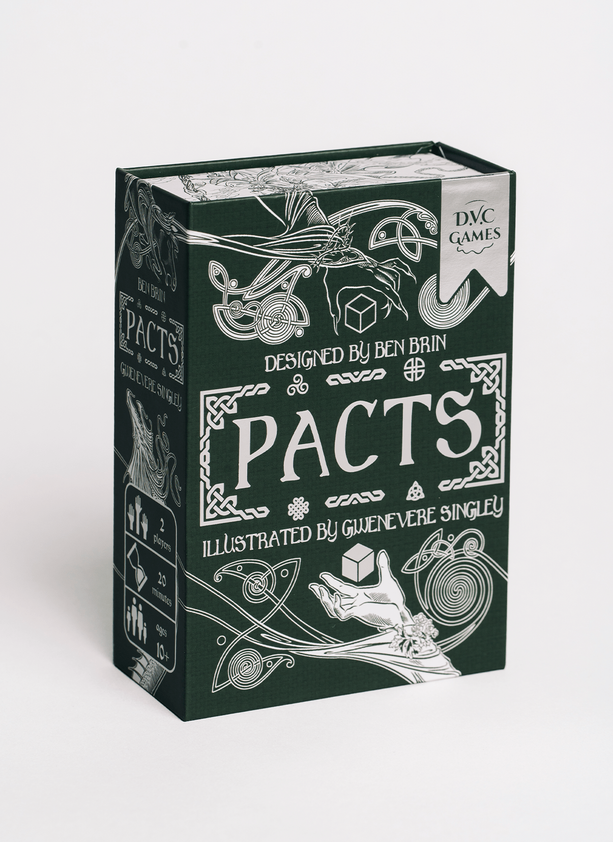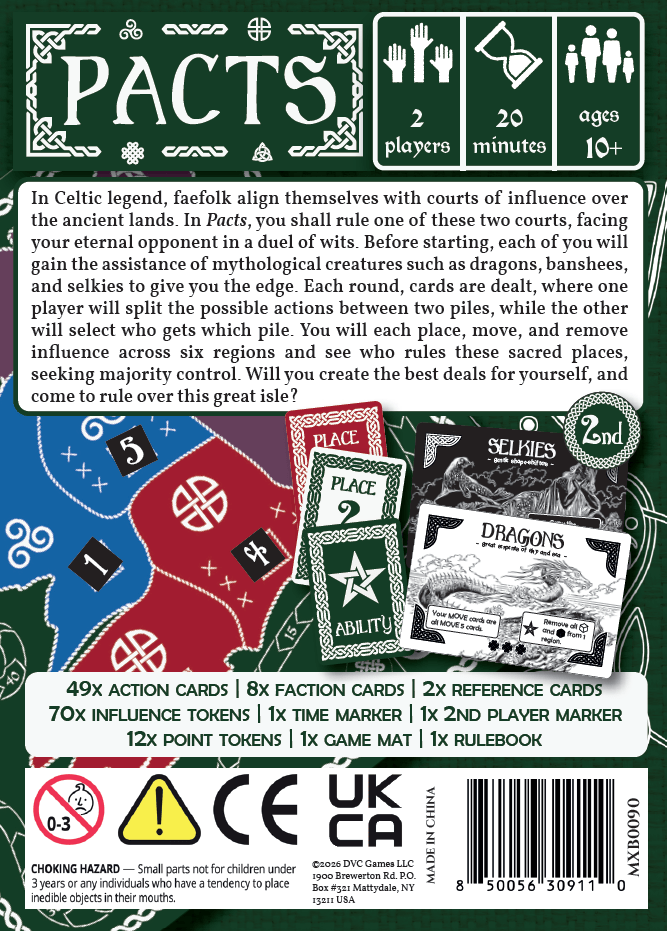 In Pacts, you shall rule one of these two courts, facing your eternal opponent in a duel of wits. Before starting, each of you will gain the assistance of mythological creatures such as dragons, banshees, and selkies to give you the edge. Each round, cards are dealt, where one player will split the possible actions between two piles, while the other will select who gets which set. You will each place, move, and remove influence across six regions and see who rules these sacred places, seeking majority control. The player who scores the best after three and six rounds will be declared the new ruler of this great isle.