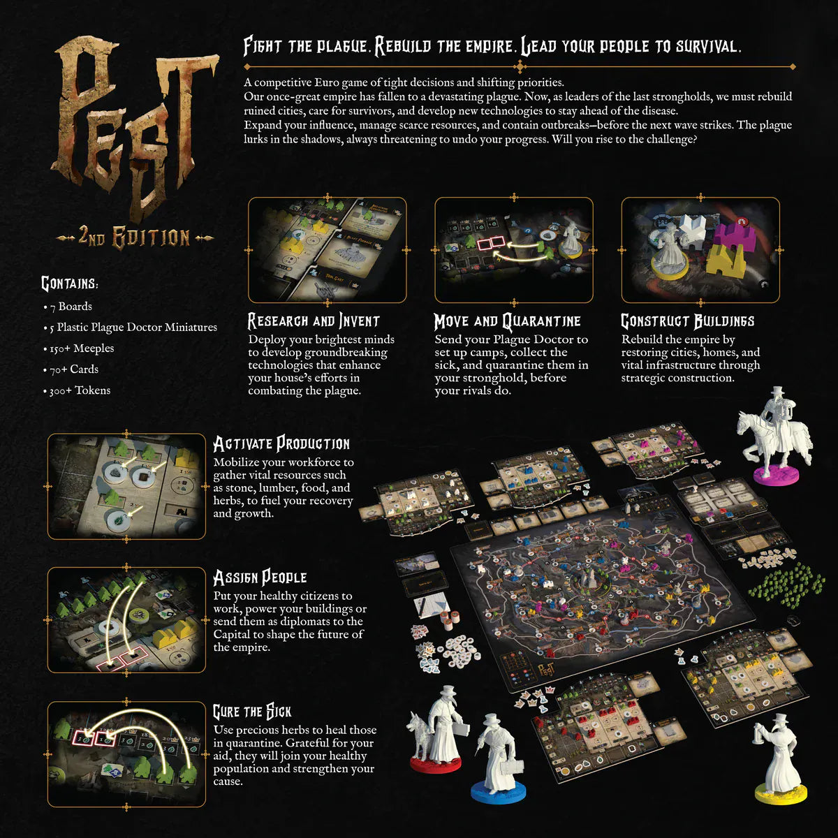 Fight against the cataclysmic plague and rebuild the once-fallen empire in this strategic euro board game.