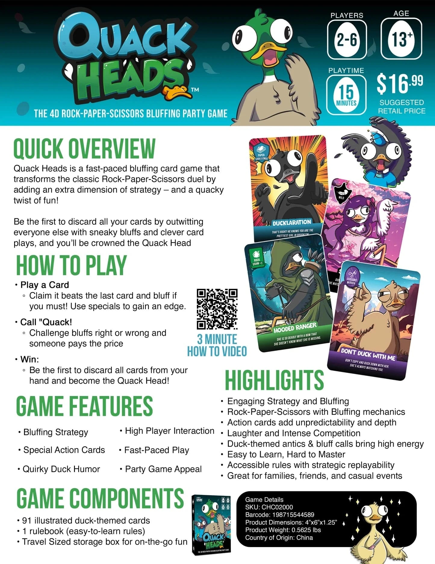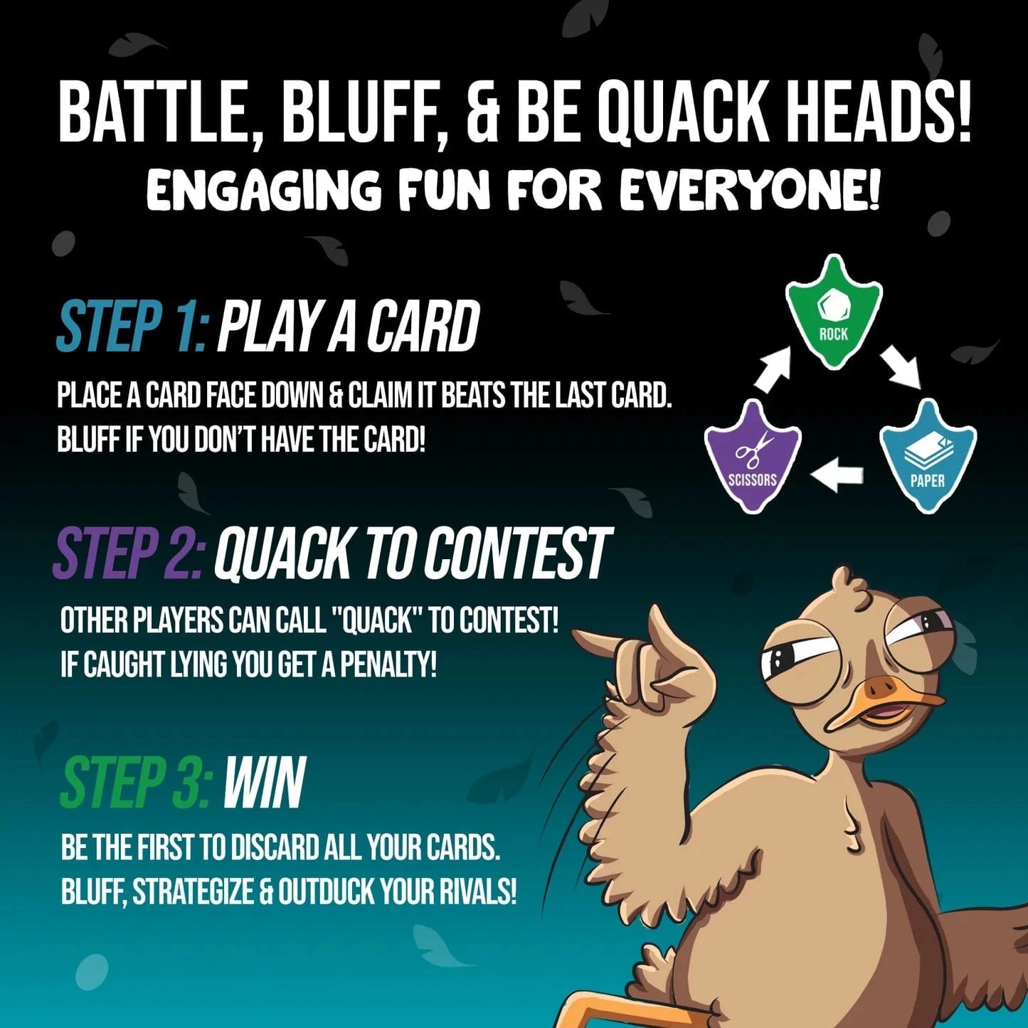LAUGHTER & INTENSE COMPETITION: With its quirky duck-themed challenges and the thrill of calling out bluffs, Quack Heads guarantees laughter and lively competition. The fast-paced nature of the game ensures everyone stays engaged, and the contesting mechanic adds an extra layer of suspense and fun.