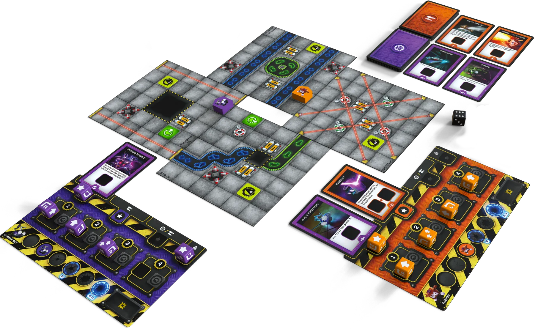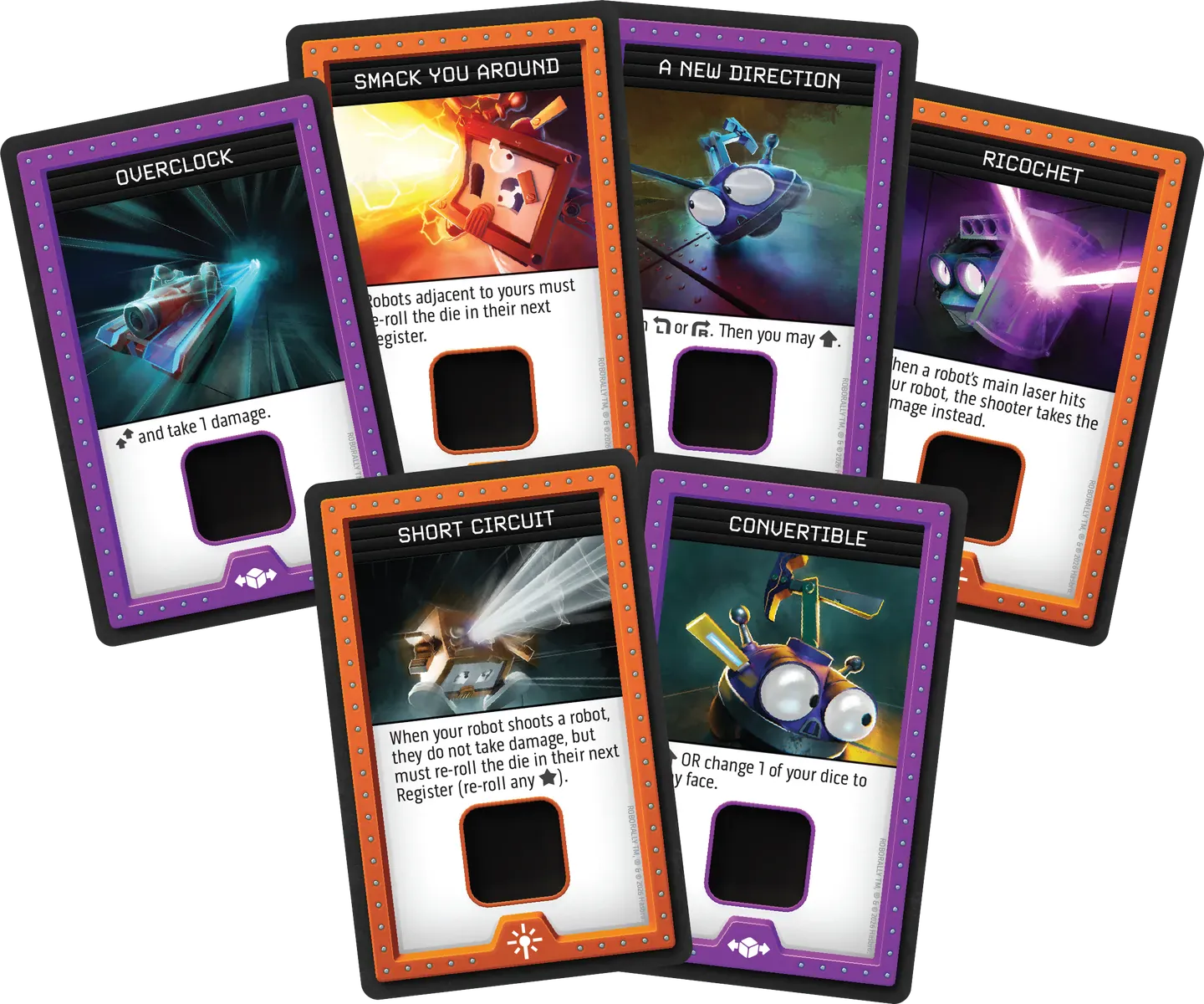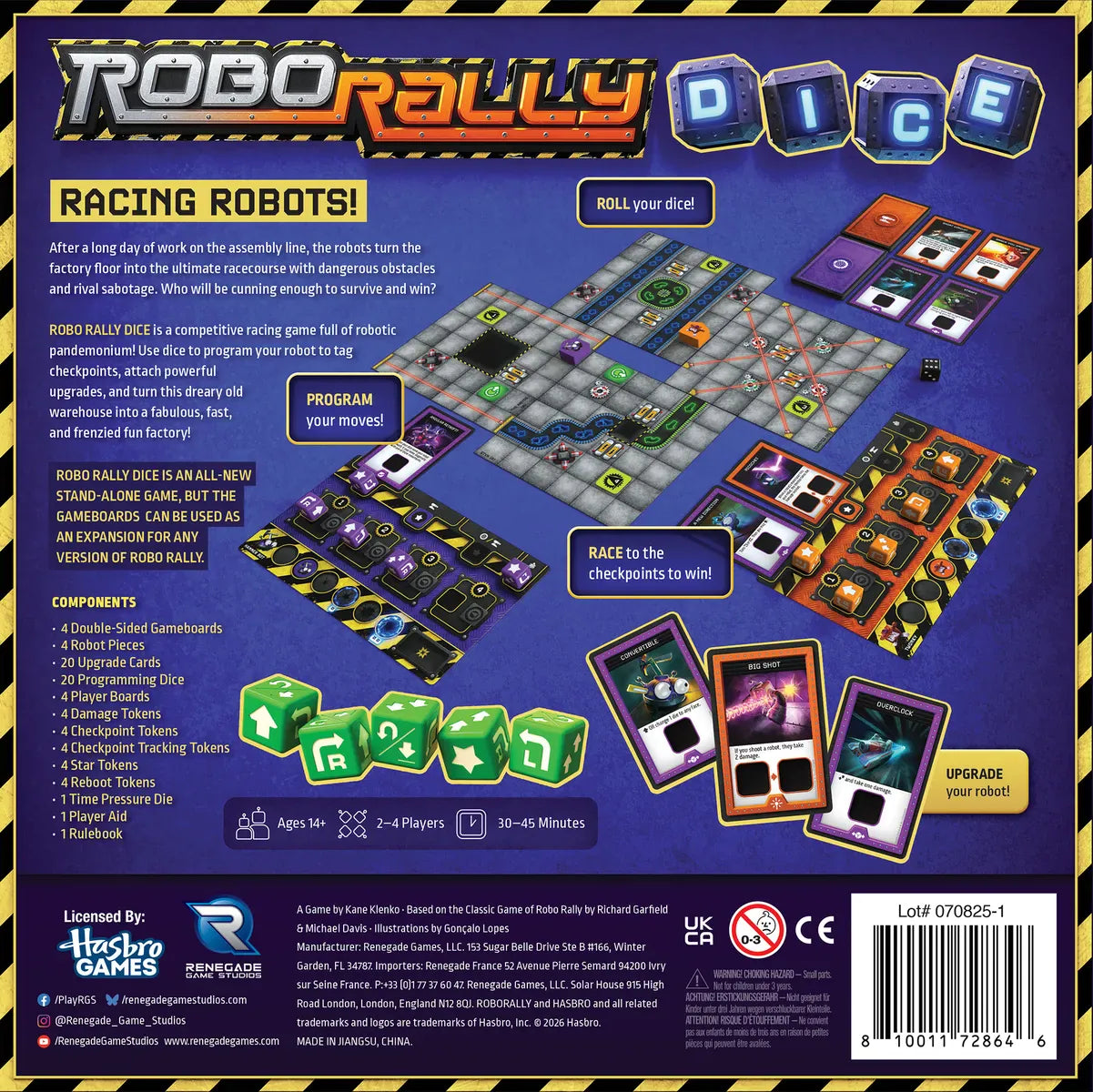 Robo Rally Dice is a competitive racing game full of robotic pandemonium! Use real-time dice rolling to program your robot to tag checkpoints, attach powerful upgrades, and turn this dreary old warehouse into a fabulous, fast, and frenzied fun factory! Robo Rally Dice is a standalone game, but the gameboards can be used as an expansion for any version of Robo Rally.