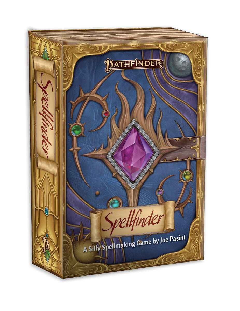In the silly, spell-slinging party game, Spellfinder, you and your friends are student wizards at a prestigious magical university, mashing up magic words to create problem-solving spells! With thousands of possible scenarios and countless spells, you’ll have a blast coming up with zany magical solutions to the perils that plague high fantasy townsfolk—from the mundane to the mystical—and you’ll never play the same game twice! The game supports 3 to 7 players, plays in about 20 minutes, and comes with 225 scroll cards with magic words, 100 problem cards to mix and match for endless scenarios, and 84 seals of approval to award points to the best spells. Designed by: Joe Pasini.
