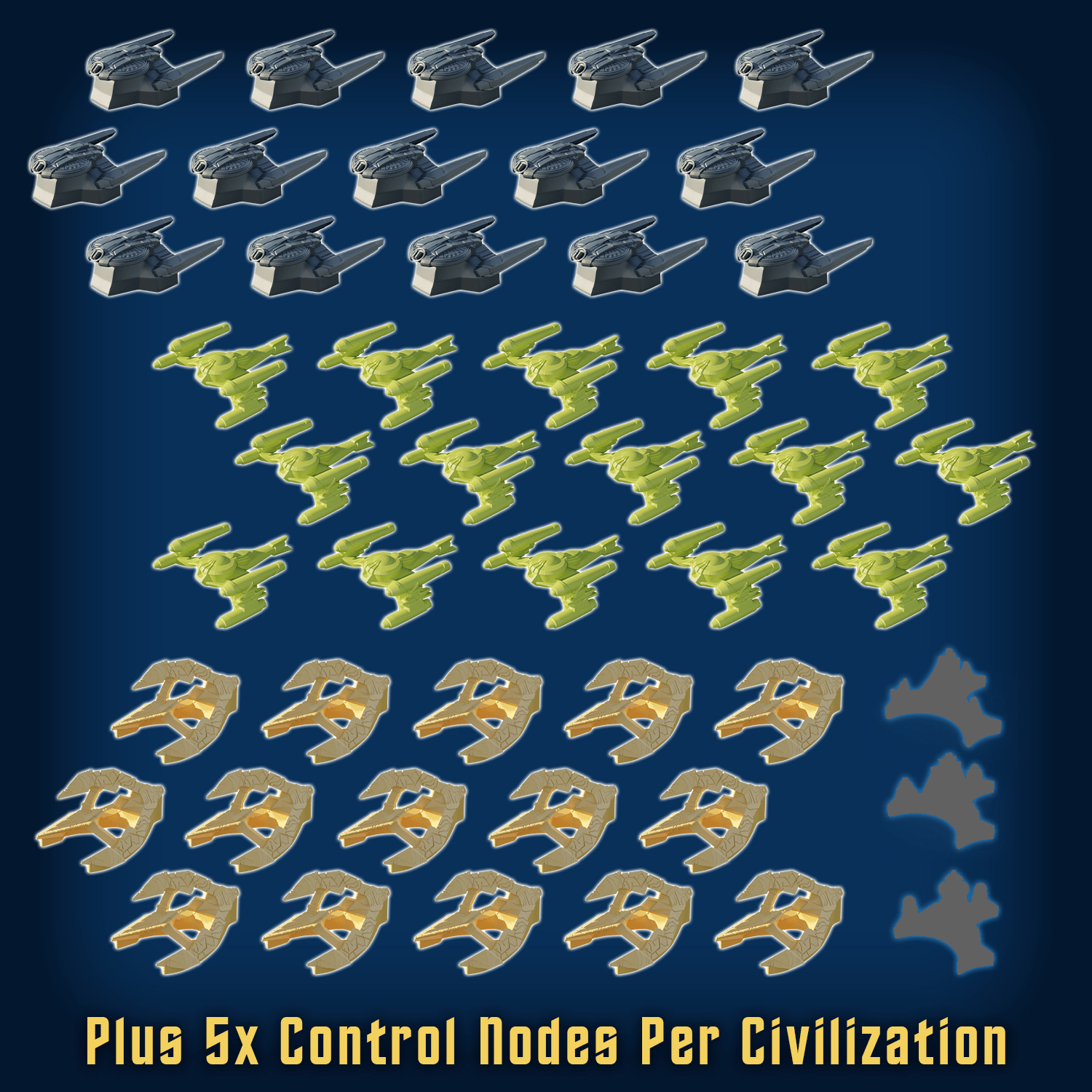 45 Starships (15 per Civilisation) and 15 Control Nodes (5 per Civilisation) for the: Gorn, Tholians and Terran Empire.