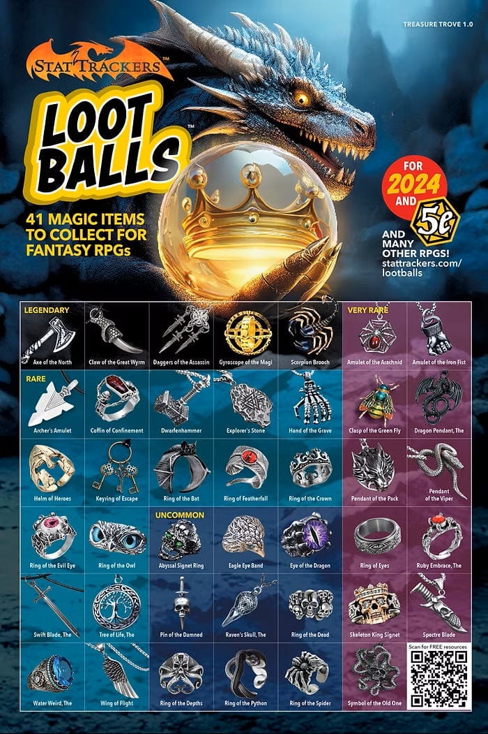 - Each Loot Ball Mystery Pack contains one random metal magic item trinket and rules scroll with stats to use the item in your fantasy RPG games.