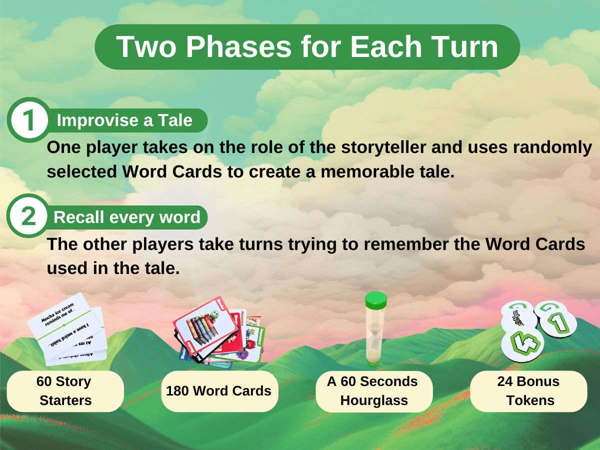 - LOVED BY FANS OF IMPROV, MEMORY & PARTY GAMES: Each 60-second round challenges players to improvise funny stories using tales cards, while others listen closely to remember the cards and score points.
