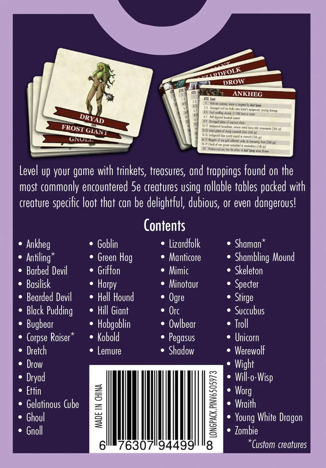 The Deck of Loot is a must-have tool for D&D 5E Game Masters, designed to enhance your campaigns with unique trinkets, treasures, and other trappings found by players. This deck transforms your adventures by providing rollable tables for creature-specific loot, adding depth and excitement to every encounter. Roll a D20 to uncover whether the spoils are dangerous, dubious, or delightful, with each table tailored to some of the most iconic creatures in DnD 5E. Every card showcases stunning original artwork and easy-to-read item descriptions with estimated gold values, making it a perfect blend of functionality and inspiration for your tabletop adventures.