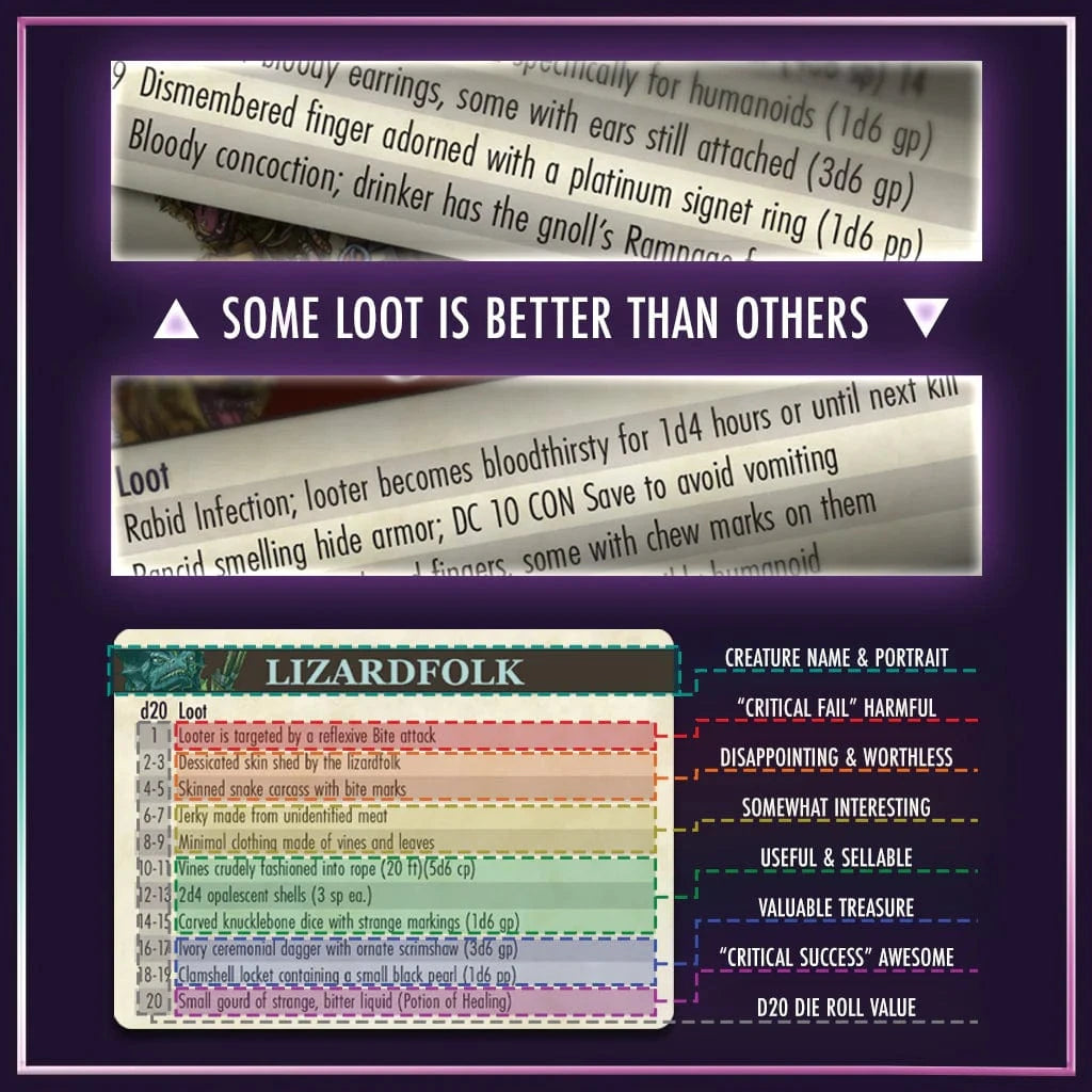 - Dynamic Loot Tables: Rollable d20 tables randomize results and excite players with