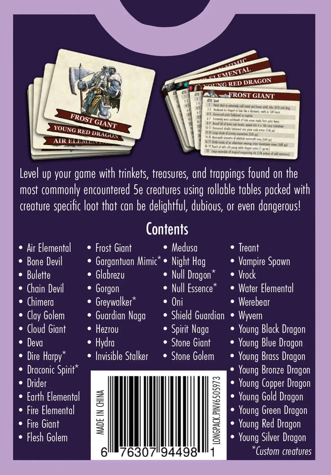 The Deck of Loot is a must-have tool for D&D 5E Game Masters, designed to enhance your campaigns with unique trinkets, treasures, and other trappings found by players. This deck transforms your adventures by providing rollable tables for creature-specific loot, adding depth and excitement to every encounter. Roll a D20 to uncover whether the spoils are dangerous, dubious, or delightful, with each table tailored to some of the most iconic creatures in DnD 5E. Every card showcases stunning original artwork and easy-to-read item descriptions with estimated gold values, making it a perfect blend of functionality and inspiration for your tabletop adventures.