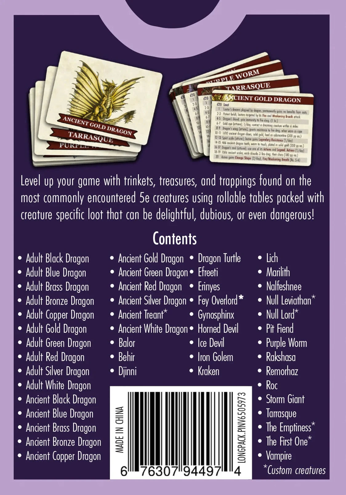 The Deck of Loot is a must-have tool for D&D 5E Game Masters, designed to enhance your campaigns with unique trinkets, treasures, and other trappings found by players. This deck transforms your adventures by providing rollable tables for creature-specific loot, adding depth and excitement to every encounter. Roll a D20 to uncover whether the spoils are dangerous, dubious, or delightful, with each table tailored to some of the most iconic creatures in DnD 5E. Every card showcases stunning original artwork and easy-to-read item descriptions with estimated gold values, making it a perfect blend of functionality and inspiration for your tabletop adventures.