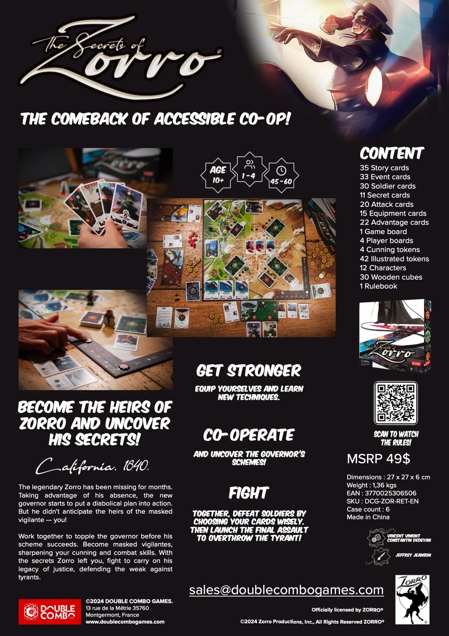 The Secrets of Zorro is a light strategy game with hidden information, some placement, many cards and combos.