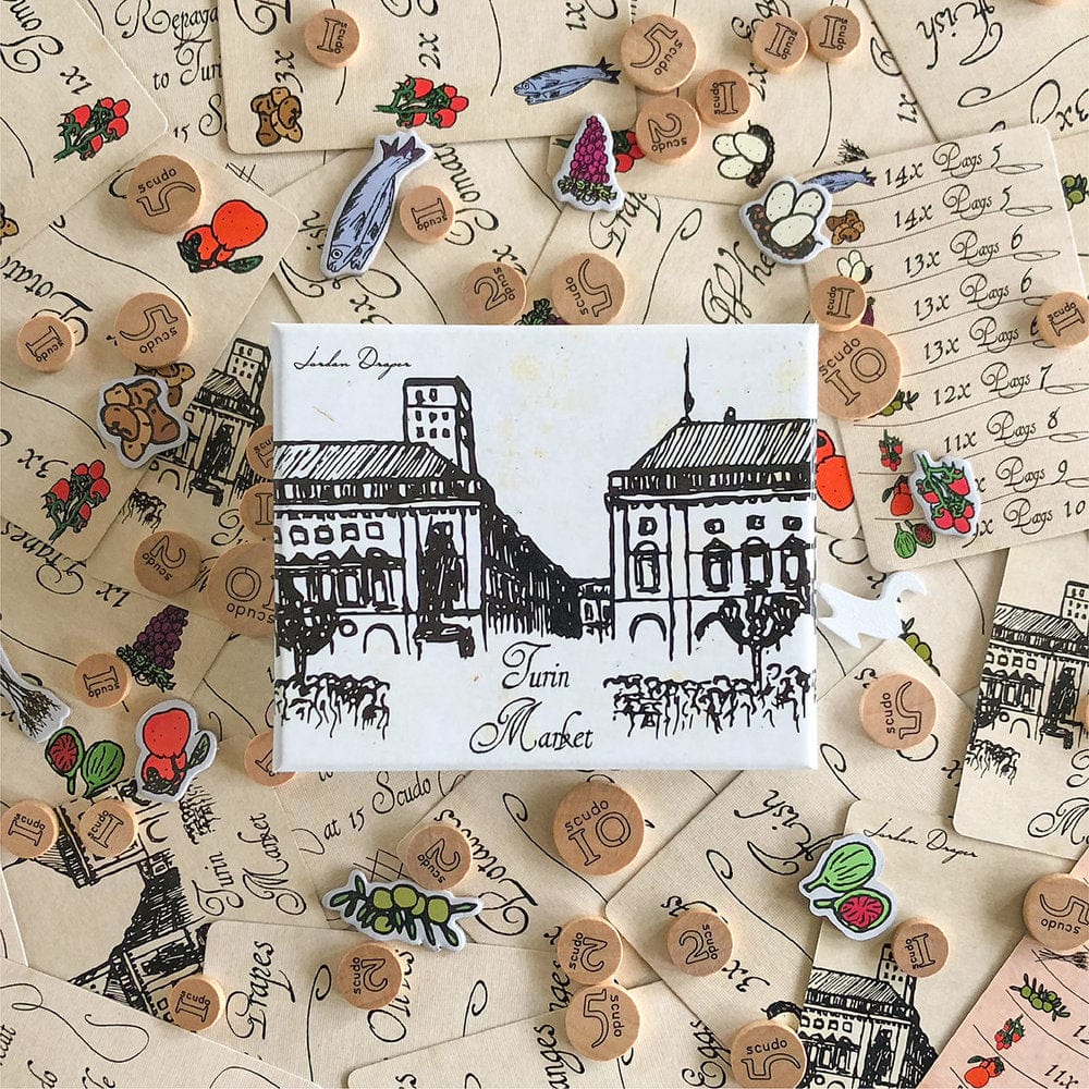 Turin Market is an auction set collection game for 2-5 players, takes 10-30 minutes to play, and utilizes bluffing, silent auctions, sales, and loans. It is incredibly quick and easy to pick up, but has a deep breadth of strategy driven by player interaction and perceptive card value.