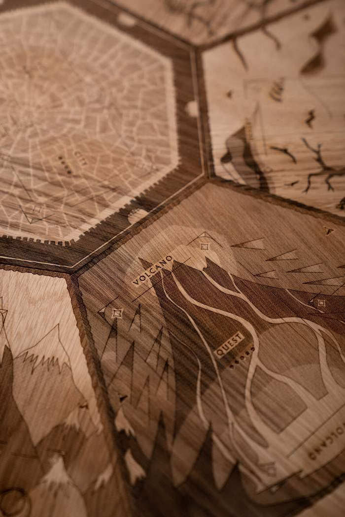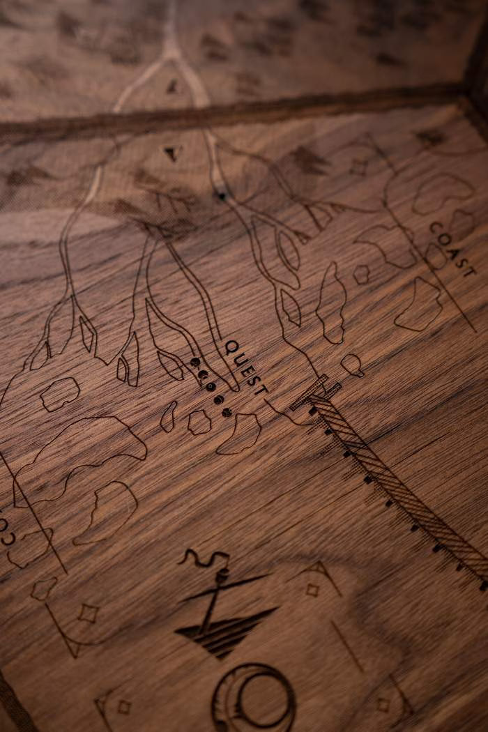 Every board measures 3/4-inch thick and spans 26 inches wide when set up, giving it a substantial, premium feel on your table. The White Oak and Walnut versions feature laser-engraved artwork, preserving the warmth and texture of the woodgrain. The Inked White Oak uses a UV inking process that applies the design directly onto the surface—resulting in rich color, striking contrast, and a smooth finish that still lets the natural grain shine through.