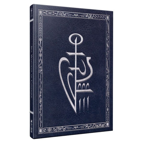 The Sea Wardens of Cothique Collector's Edition comes wrapped in deep blue faux leather, with pages edged in silver and a silver satin bookmark. The cover is adorned with a commanding silver rune of Mathlann, the tempestuous Elven god of storm and sea. The central rune is bordered with distinctive designs used by the High Elf military and navy.
