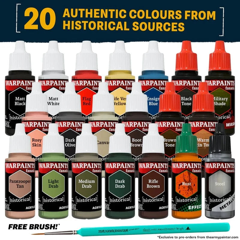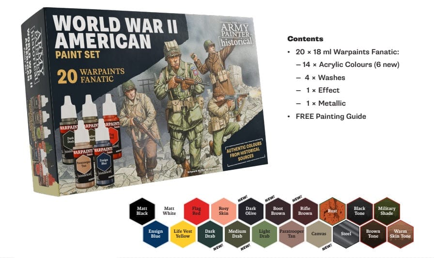 Unleash the Power of Democracy! The American WWII set features carefully curated colours, selected with the help of expert historians, reflecting the iconic uniforms and equipment of the U.S. Armed Forces. Each Historical set blends the high-performance Warpaints Fanatic Acrylics, Washes, and Metallics, combining trusted favorites with new, exclusive colours that perfectly capture the tone of the era. From the distinctive drab of the M1 Garand to the vibrant hues of the airborne division, this set captures the essence of the Greatest Generation.