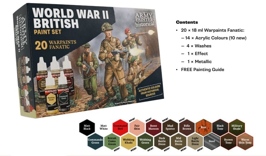 Stand Firm, Keep Calm, and Carry On! The British WWII set features era-specific colours, selected with the help of expert historians, representing the resilient spirit of the British Armed Forces. Each Historical set blends the high-performance Warpaints Fanatic Acrylics, Washes, and Metallics, combining trusted favorites with new, exclusive colours that perfectly capture the tone of the era. From the classic khaki of the infantry to the deep green of the commandos, this set allows you to accurately depict the uniforms and equipment of the men and women who stood against tyranny.