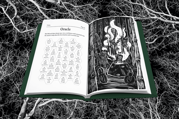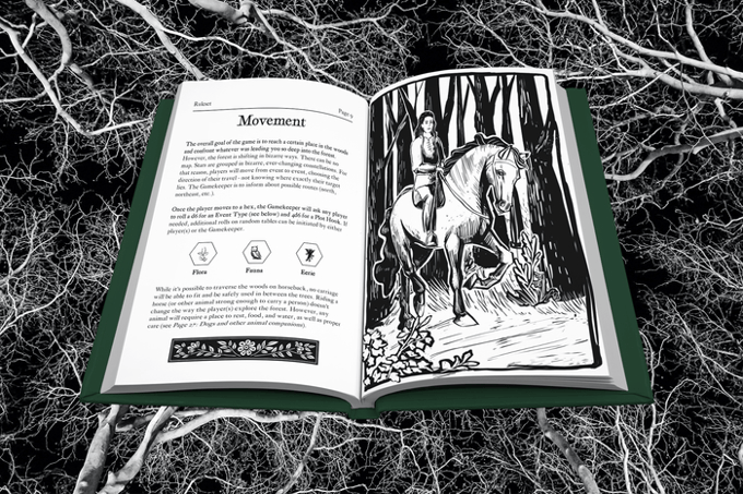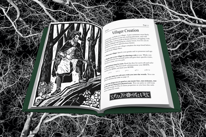 A minimalistic role-playing game in which players will fill the shoes of 18th-century villagers on a journey into mysterious, dark woods. Minimalistic and atmospheric, solo and GM-less friendly (84 pages).