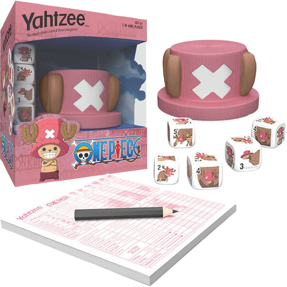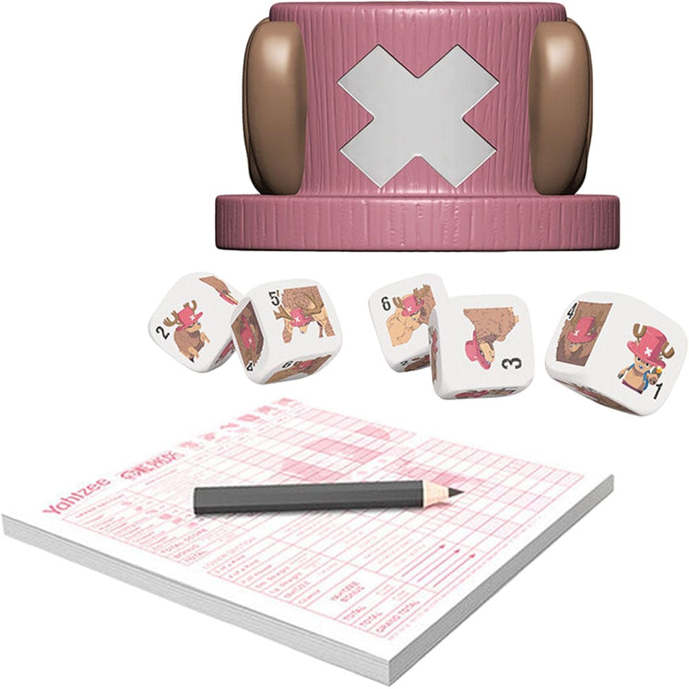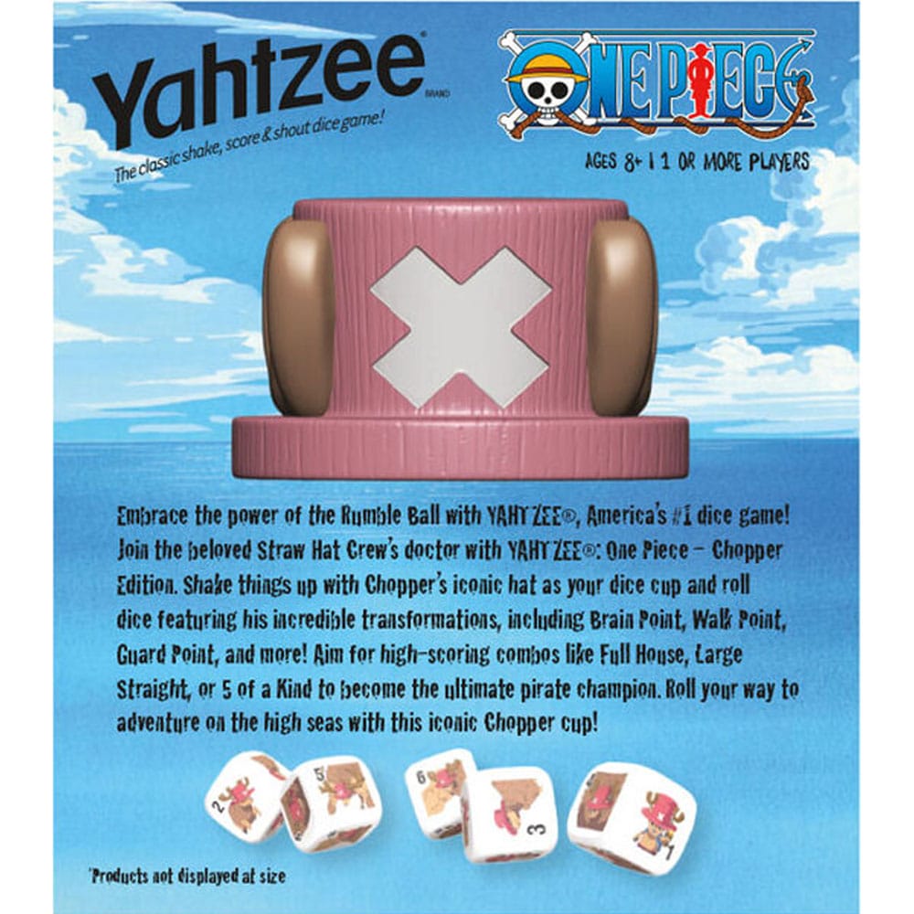Set sail for adventure with Yahtzee®: One Piece – Chopper Edition, a special twist on the classic dice-rolling game featuring the beloved reindeer doctor , Tony Tony Chopper! This collectible edition brings the excitement of One Piece to your tabletop with a Chopper - themed dice cup designed to resemble his iconic hat-wearing head, along with custom dice showcasing his different transformation forms, from Brain Point to Monster Point. Roll your way to victory by matching the best combinations, from Full House to Five of a Kind, as you harness the power of Chopper’s Rumble Ball transformations. Gather your fellow pirates and see if you have what it takes to roll the ultimate Chopper Yahtzee!