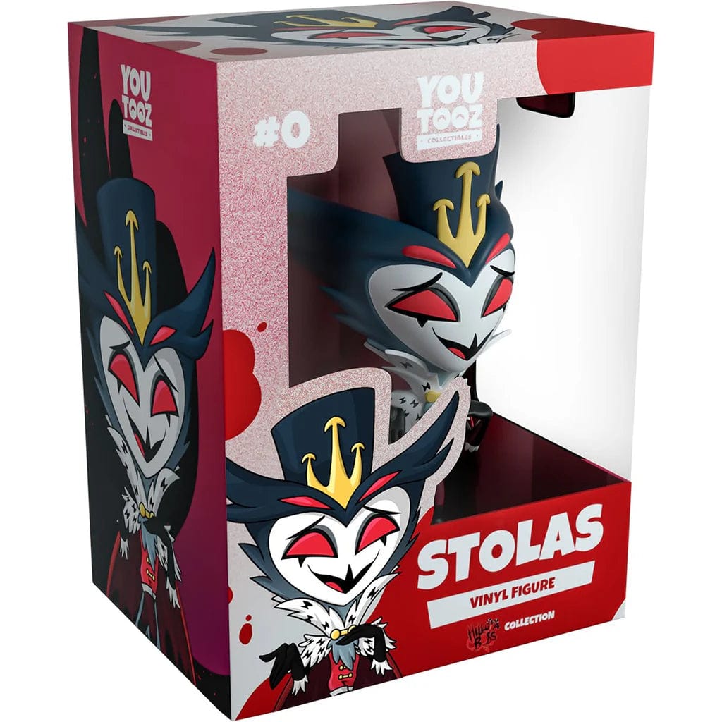 Now what could a prince of hell possibly want? Oh wait, how about a Youtooz debut! At just over 4 1/2-inches tall with thick dark plumage fanning out from their white face that has deep red eyes and a short sharp beak, their thick dark feathers sweep out to rest either side of his majestic top hat which is embellished with a gold crown. With a high white collar and shoulder caps, he raises one hand up to his ruffled collar as the other faces outward nonchalantly as a long red cloak hangs down over a red tunic with golden buttons and their feathered tail. The exterior of their packaging sees a burning silhouette against a dark background, while the interior surrounds them entirely in maroon stripes that are reminiscent of dirty wallpaper. The protective sleeve is then patterned with diagonal black and white stripes and printed with the 'Helluva Boss' logo as their figure can be seen through the large clear display window at its front.